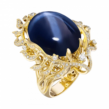 Оправа из жёлтого золота выстроена как сложный, почти органический каркас. Витиеватые линии не закрывают самоцвет, а лишь мягко поддерживают его, сохраняя максимальную открытость поверхности и позволяя свету свободно взаимодействовать с сапфиром. Такая архитектура подчёркивает масштаб центрального камня и усиливает впечатление его спокойной, уверенной силы.