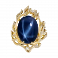 В центре композиции - звёздчатый сапфир весом 34,59 карата, привезённый из Таиланда. Самоцветы этого происхождения известны ярко выраженным эффектом астеризма : при попадании направленного света на гладко отполированную поверхность камня проявляется чёткая световая звезда. Это редкое оптическое явление возникает благодаря микроскопическим включениям рутила, ориентированным внутри кристалла. Именно оно создаёт ощущение глубины и визуального “погружения” взгляда в тёмно-синюю бездну минерала.