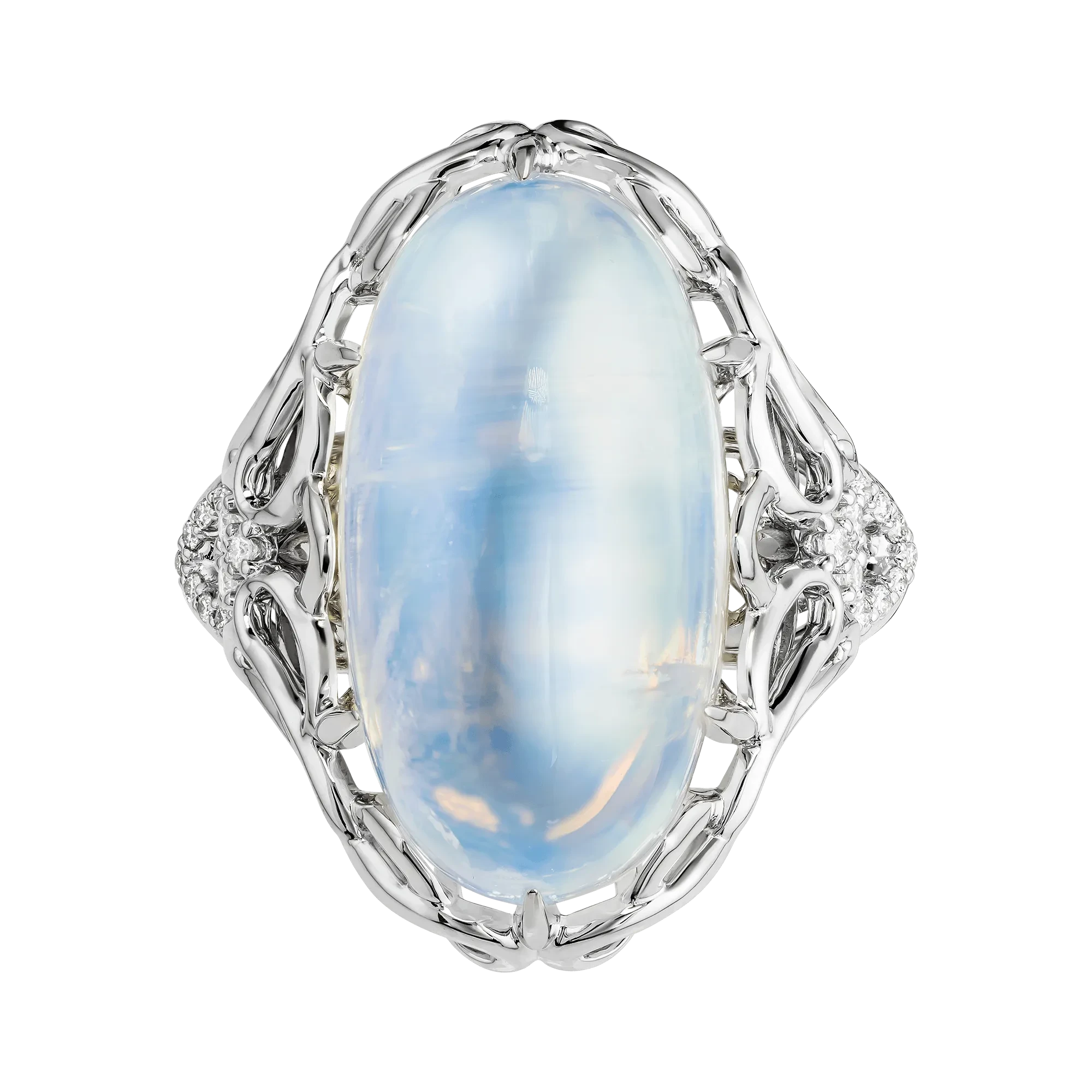 Сложная витиеватая оправа из белого золота образует вокруг самоцвета ажурное обрамление, напоминающее кружево или фантазийный орнамент. Россыпь бриллиантов усиливает ощущение глубины и добавляет холодные световые акценты, подчёркивая таинственную природу лунного камня. В результате кольцо воспринимается как ювелирный образ ночного света — спокойный, загадочный и завораживающий, где форма и металл лишь сопровождают магию природного минерала.
