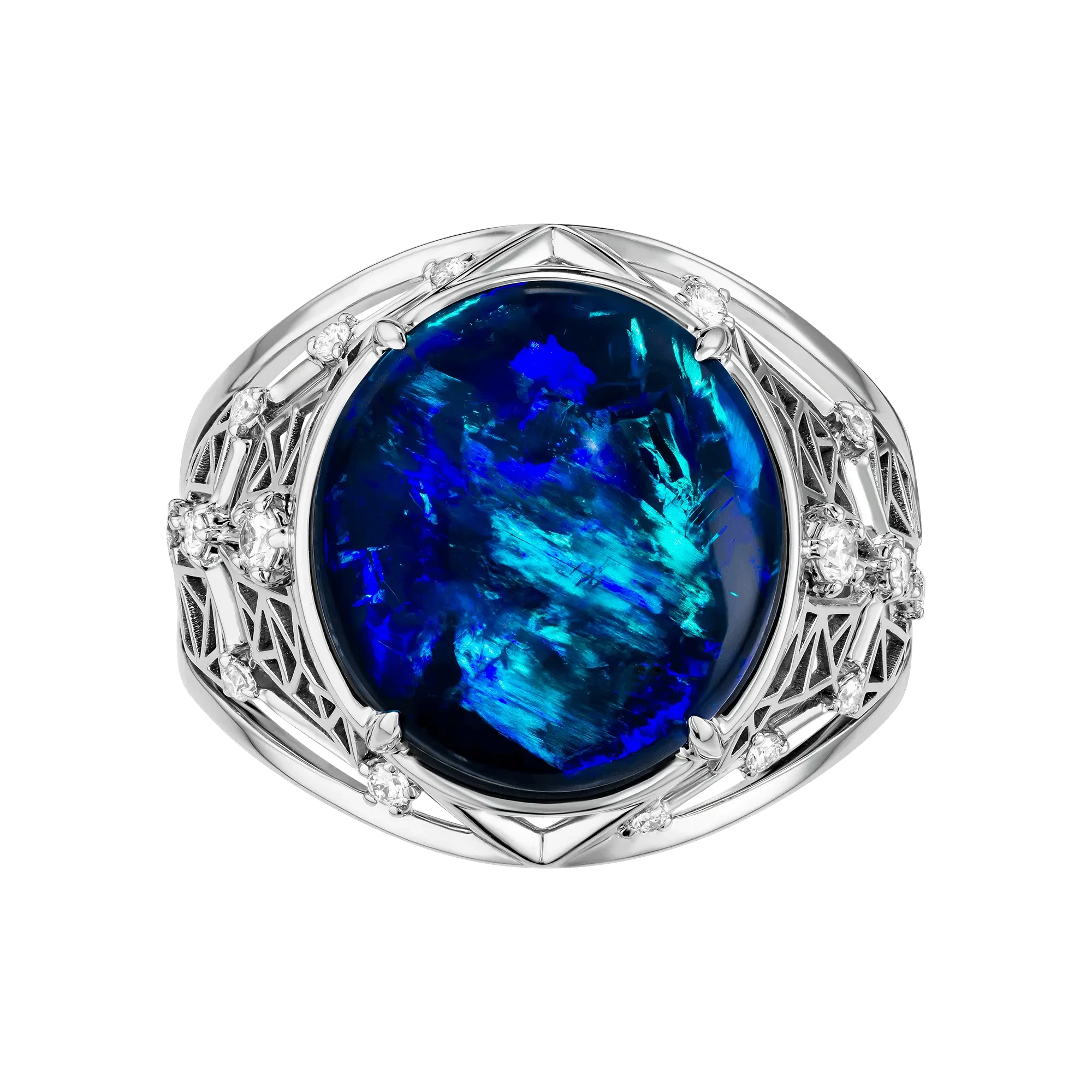 Авторское кольцо создано так, будто в его сердце заключён фрагмент космоса, пойманный в момент тихого сияния. Австралийский опал весом 6,05 карата раскрывает редчайшую палитру – глубокий синий, бирюза, вспышки неонового света. Такой опалесцентный рисунок ценится во всём мире: он считается одним из самых мистических и дорогих проявлений в природе, вызывая чувство, будто смотришь на звёздный купол из другого времени.