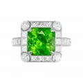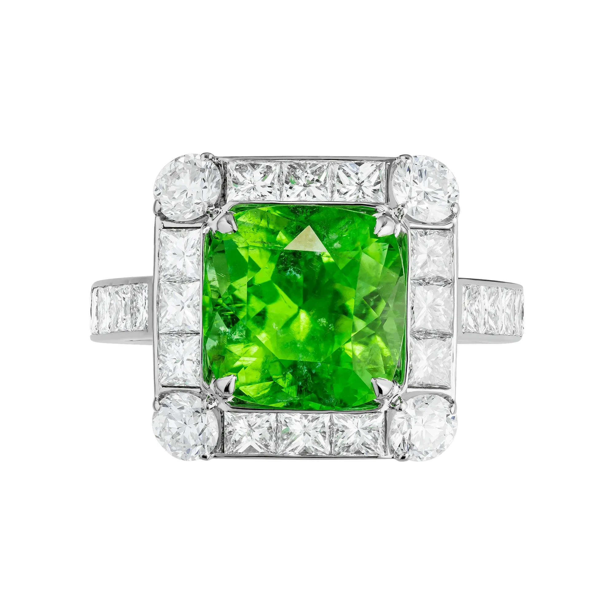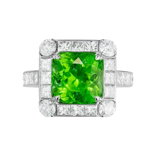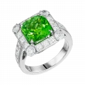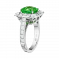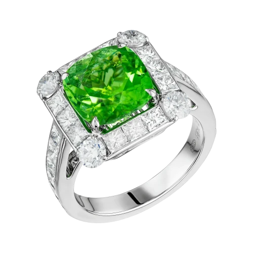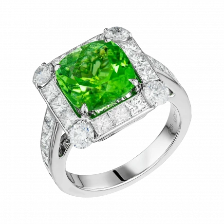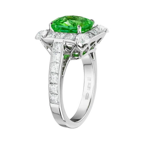 Оправа выполнена из белого золота и инкрустирована бриллиантами, формирующими чёткий световой контур вокруг центрального элемента. Архитектура украшения подчинена задаче максимального раскрытия визуальных свойств самоцвета, благодаря чему кольцо воспринимается как объект, фиксирующий редкий оптический эффект и демонстрирующий современный подход к ювелирной композиции.