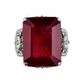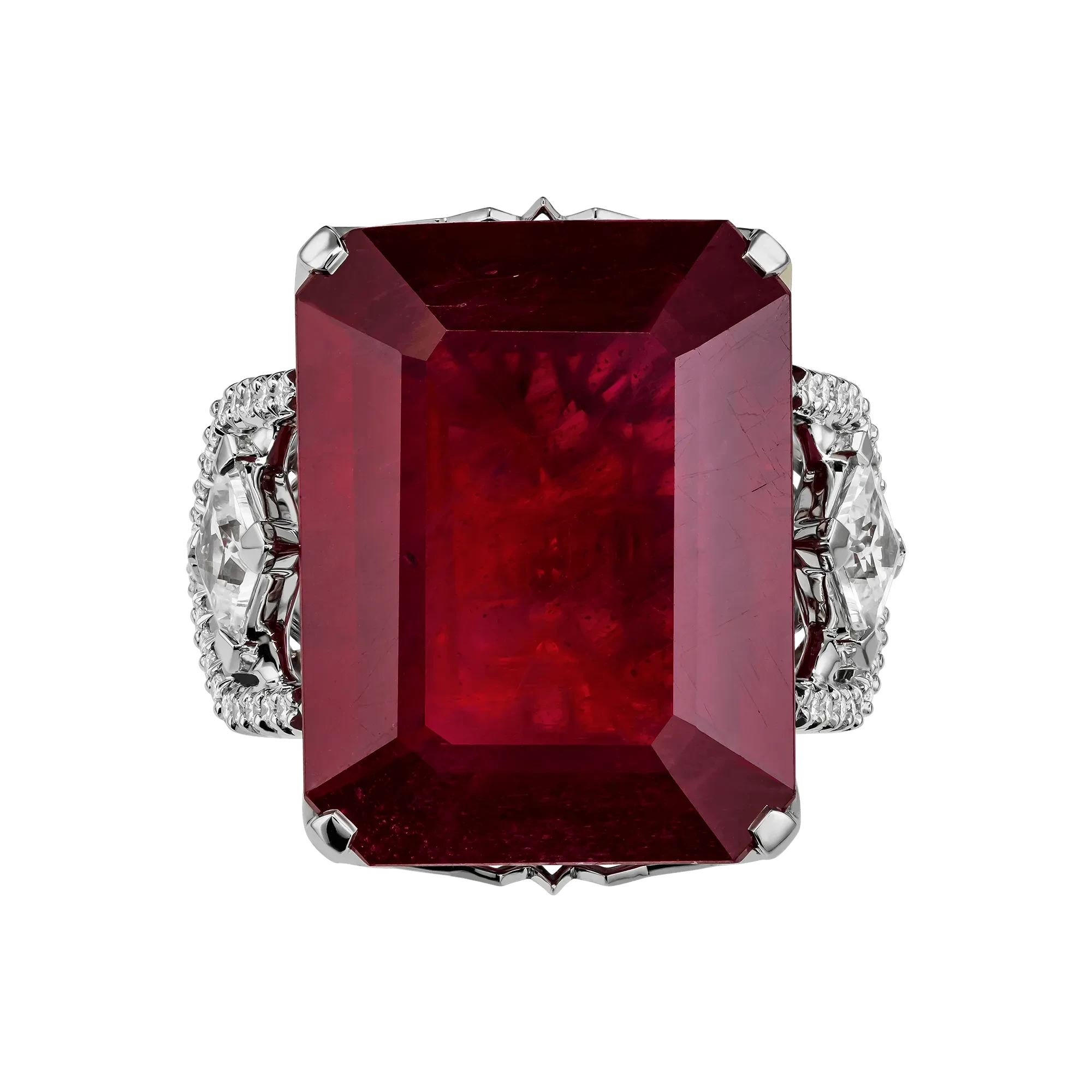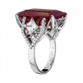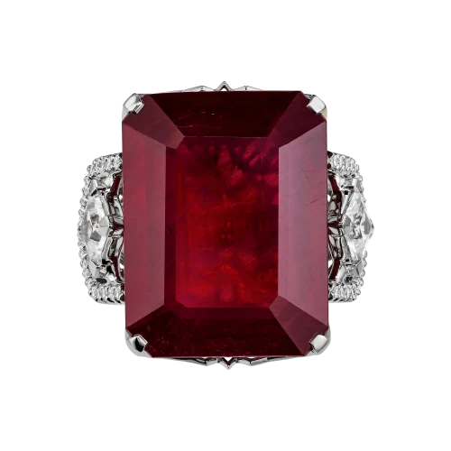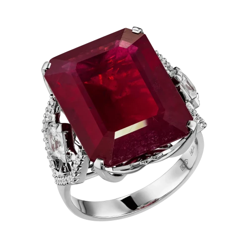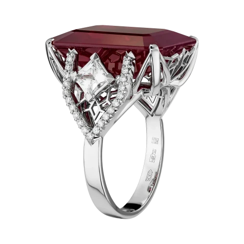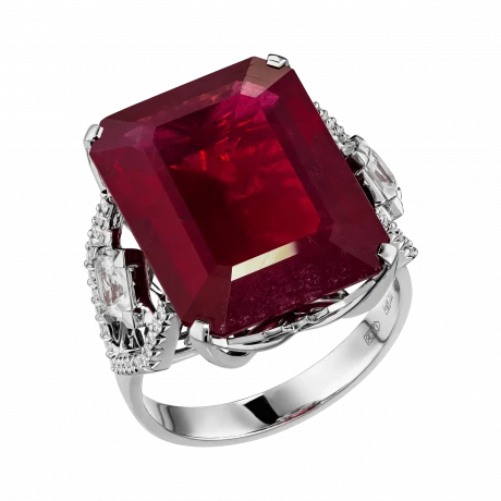 Огранка рубина подчёркивает его монолитный характер и внутреннее свечение, а архитектурная оправа из белого золота работает как система точных опор. По обе стороны от центрального камня размещены прозрачные сапфиры квадратной огранки — холодные световые акценты, выстроенные в строгом ритме. Их геометрия вступает в диалог с формой рубина, создавая ощущение выверенной конструкции, где каждый элемент имеет функциональное и визуальное значение.