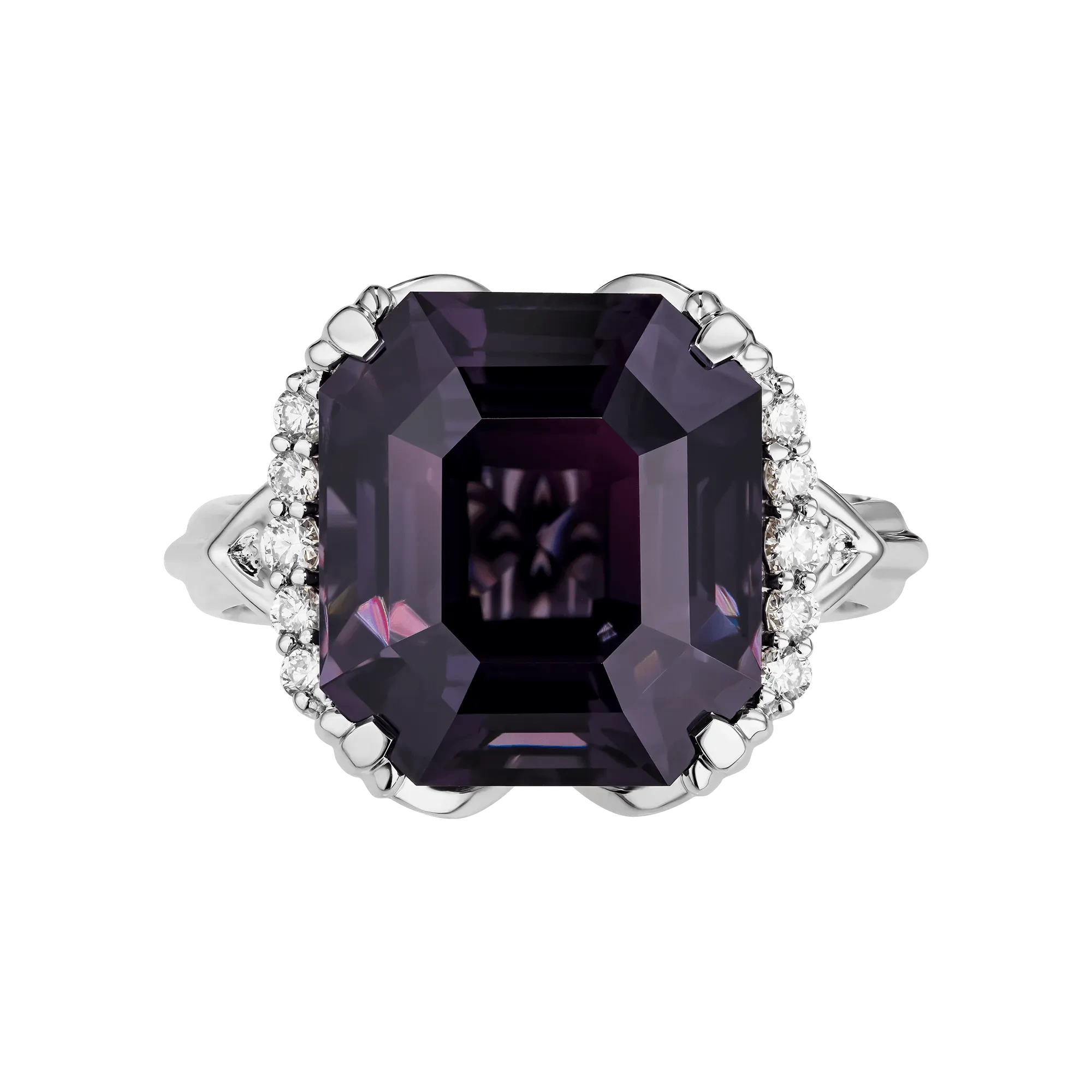 В кольце «Черничный закат» шпинель весом 10,81 карата становится центром притяжения – камнем, в котором ночь и закат встречаются в одной точке. При дневном свете он раскрывается мягкими фиалковыми бликами, при вечернем – густеет до цвета бархата, сохраняя внутреннее свечение. Именно эта переменчивость оттенков делает бирманскую шпинель объектом коллекционного вожделения и символом благородного вкуса.