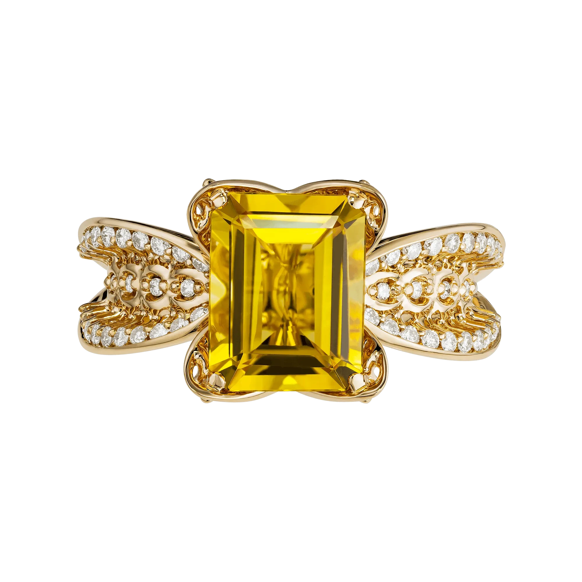Ажурная оправа из золота выстроена как игра солнечных линий, пропускающих свет сквозь форму. Бриллианты поддерживают композицию лёгкими вспышками, добавляя ритм и глубину сиянию центрального камня. «Бразильское солнце» — кольцо о тепле, которое не зависит от времени года и становится личным источником света.