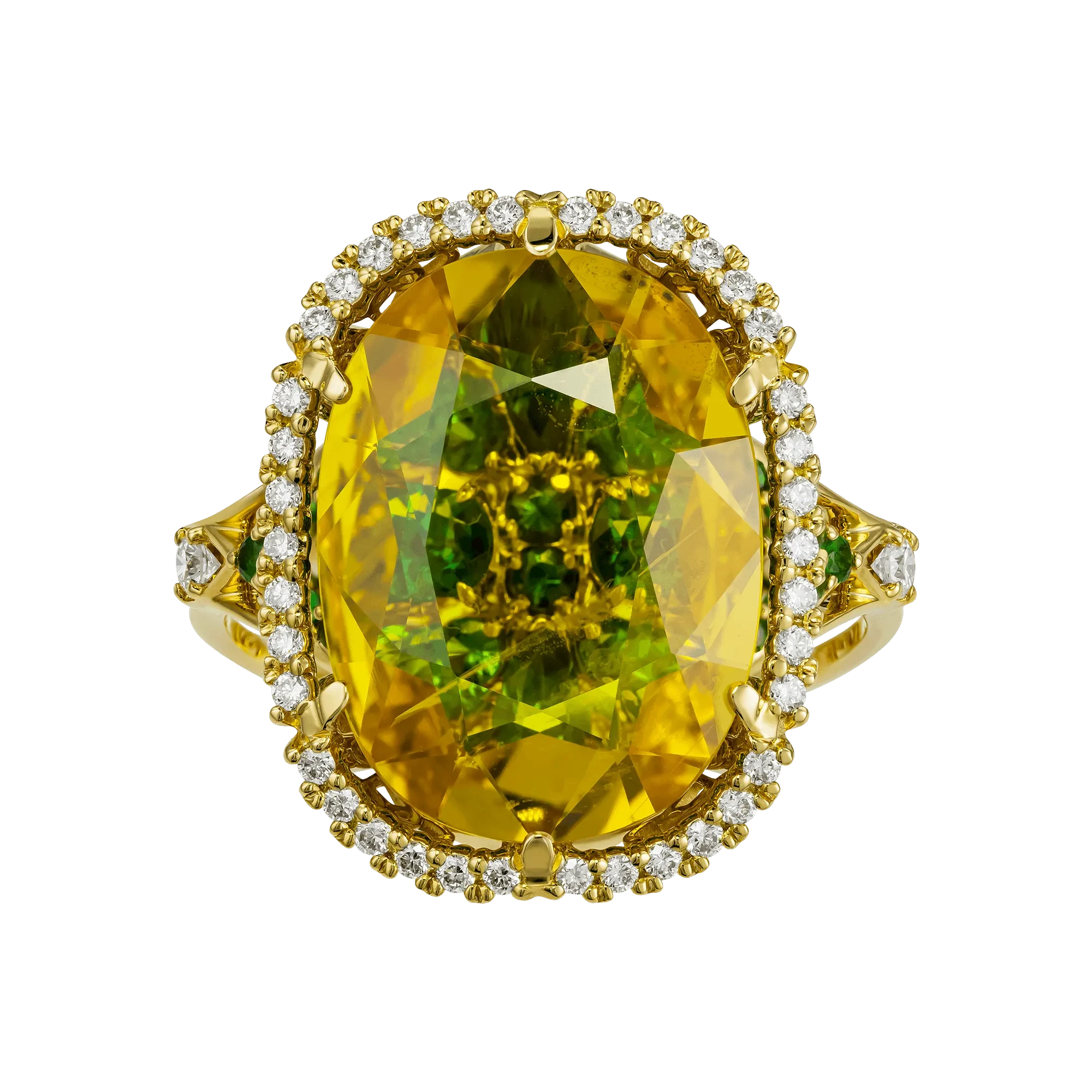 Ажурная оправа из жёлтого золота поддерживает этот ритм, а бриллиантовое обрамление придаёт украшению архитектурную точность и идеальный баланс. В глубине кольца мастера разместили узор из тсаворитов и цветных сапфиров – скрытую деталь, благодаря которой создаётся эффект внутреннего мерцания.