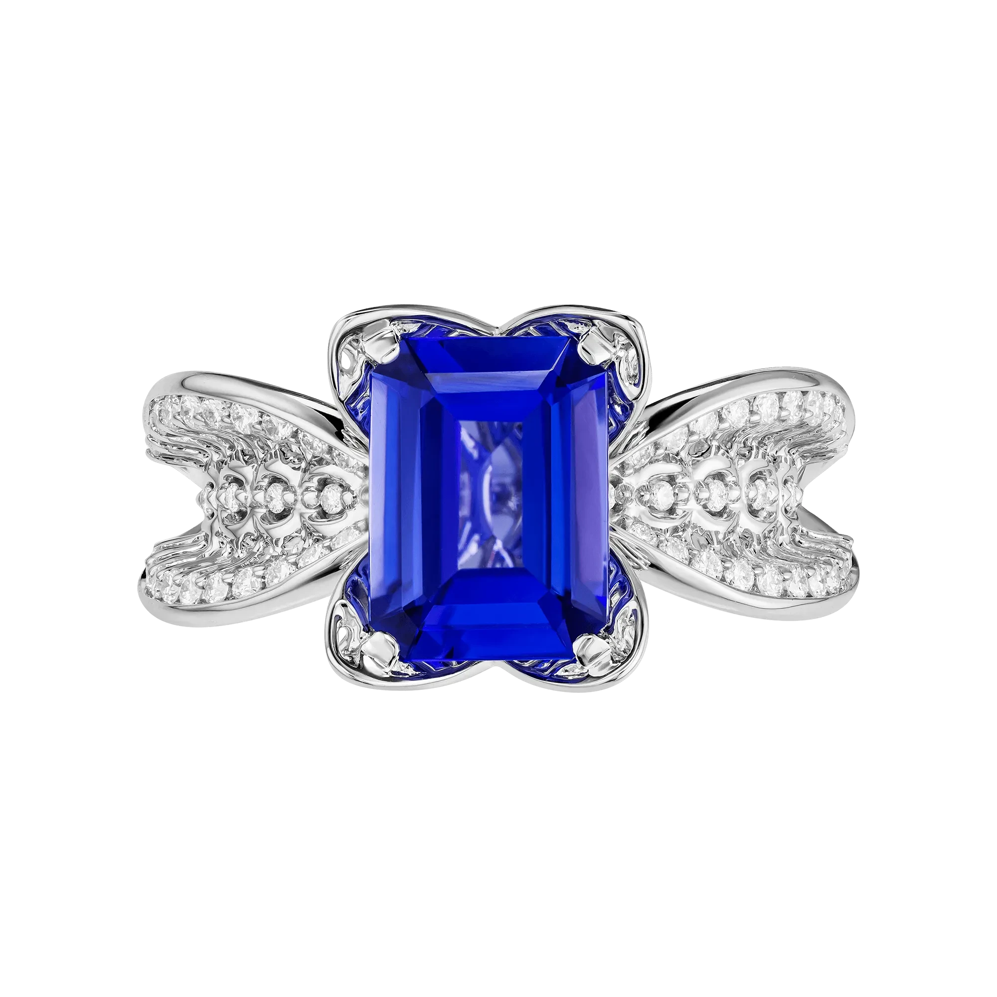 Витиеватая шинка из белого золота инкрустирована россыпью бриллиантов, формирующих сложный, но выверенный ритм. Их холодное сияние усиливает графичность центрального камня и подчёркивает его глубину. Металл и свет работают как архитектурная основа, создавая чёткий контраст, на котором синий цвет звучит особенно выразительно.