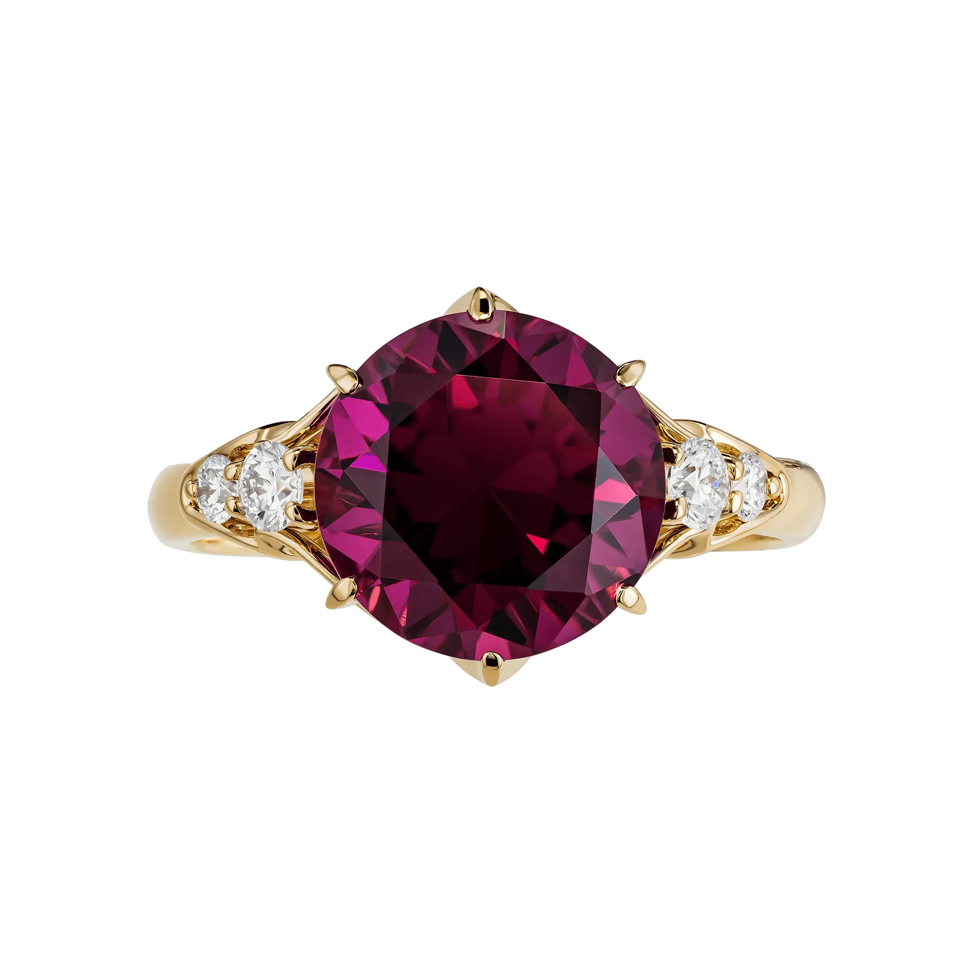 В центре композиции — танзанийский родолит весом 5,0 карат, одна из самых выразительных разновидностей граната. Этот самоцвет ценится за высокую прозрачность и насыщенный малиново-винный оттенок с лёгким фиолетовым подтоном, возникающим благодаря природному сочетанию магния и железа в структуре кристалла. Родолит сохраняет интенсивность цвета при различном освещении, а его огранка раскрывает живую, но собранную игру граней.