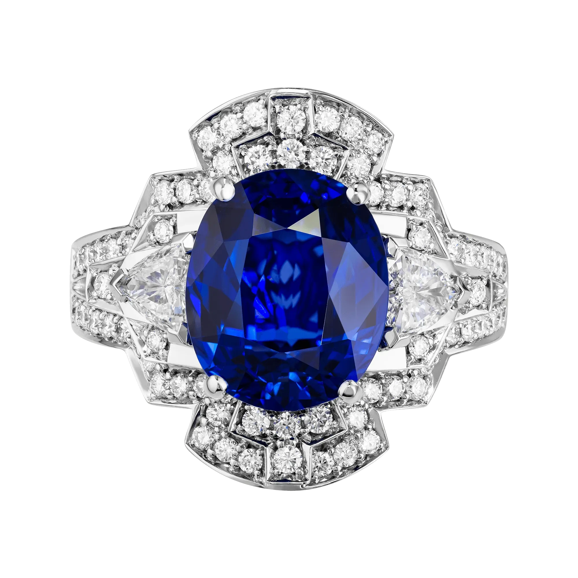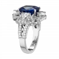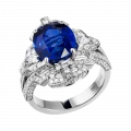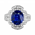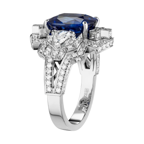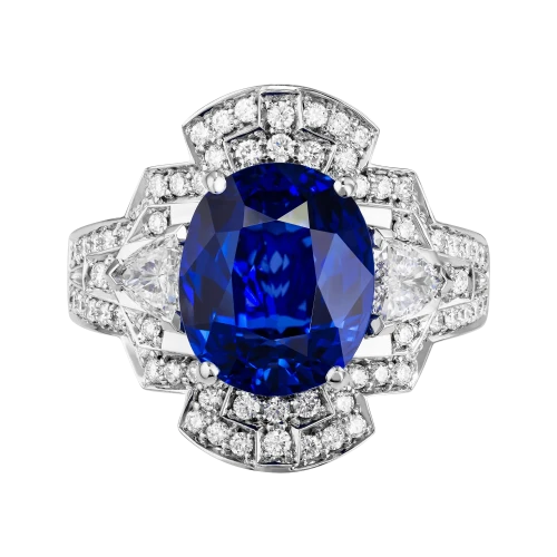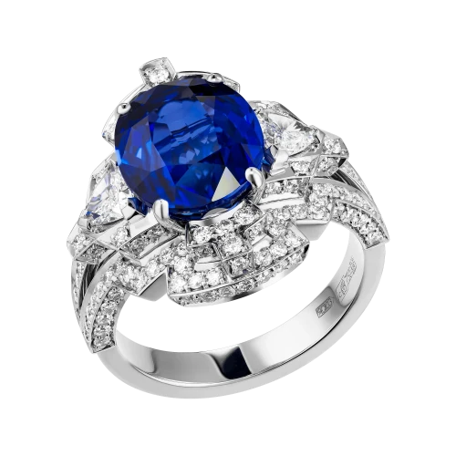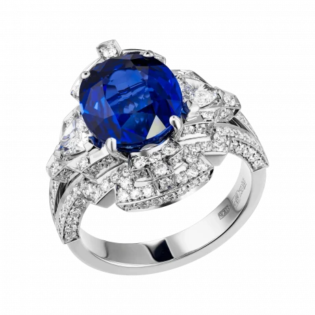 Белое золото оправы и сияние бриллиантов образуют изящный герб света, подчеркивающий величие центрального камня – сапфира цвета Royal Blue весом 6,02 карата, привезённого со Шри-Ланки. Этот оттенок – королевский синий – издавна считался символом верности, мудрости и власти. Он украшал мантии британских монархов и эмблемы орденов, включая Орден Подвязки – высшую награду короны.