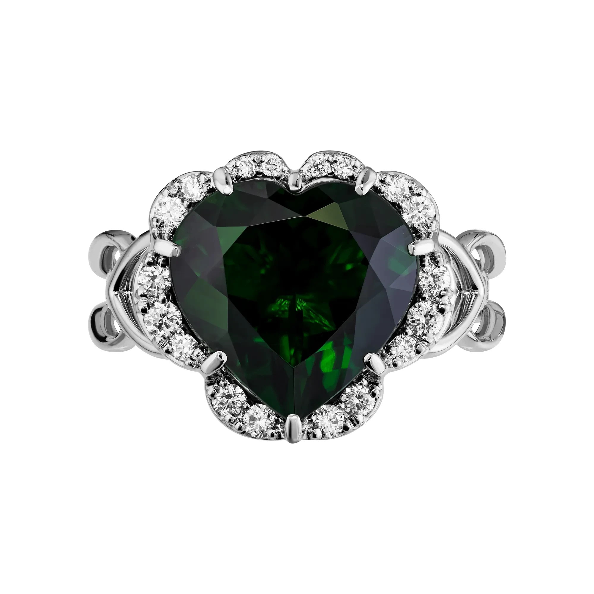 Огранка в форме сердца подчёркивает природную красоту турмалина, превращая его в символ чувства, рождающегося не в словах, а в молчании. Оправа из белого золота выполнена в виде переплетающихся линий — от тонкого рисунка шинка до утончённых завитков, повторяющих форму сердечного ритма.