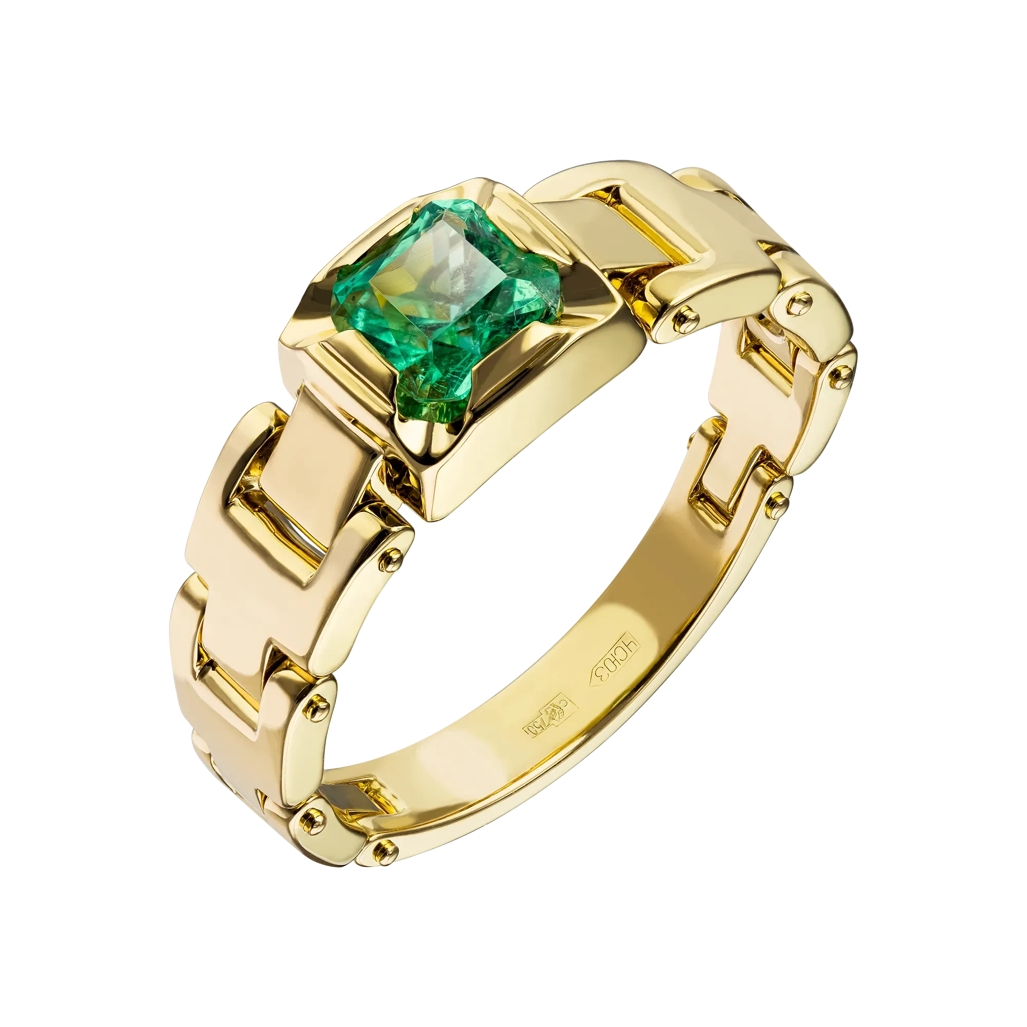 Кульминацией потрясающего кольца стал чистейший изумруд весом 1,20 карат. Невероятно вдохновляющий самоцвет, символ надежды и мудрости смотрится роскошно, представ идеальным центром эксклюзивного украшения, которое гармонично дополнит любой мужской образ.