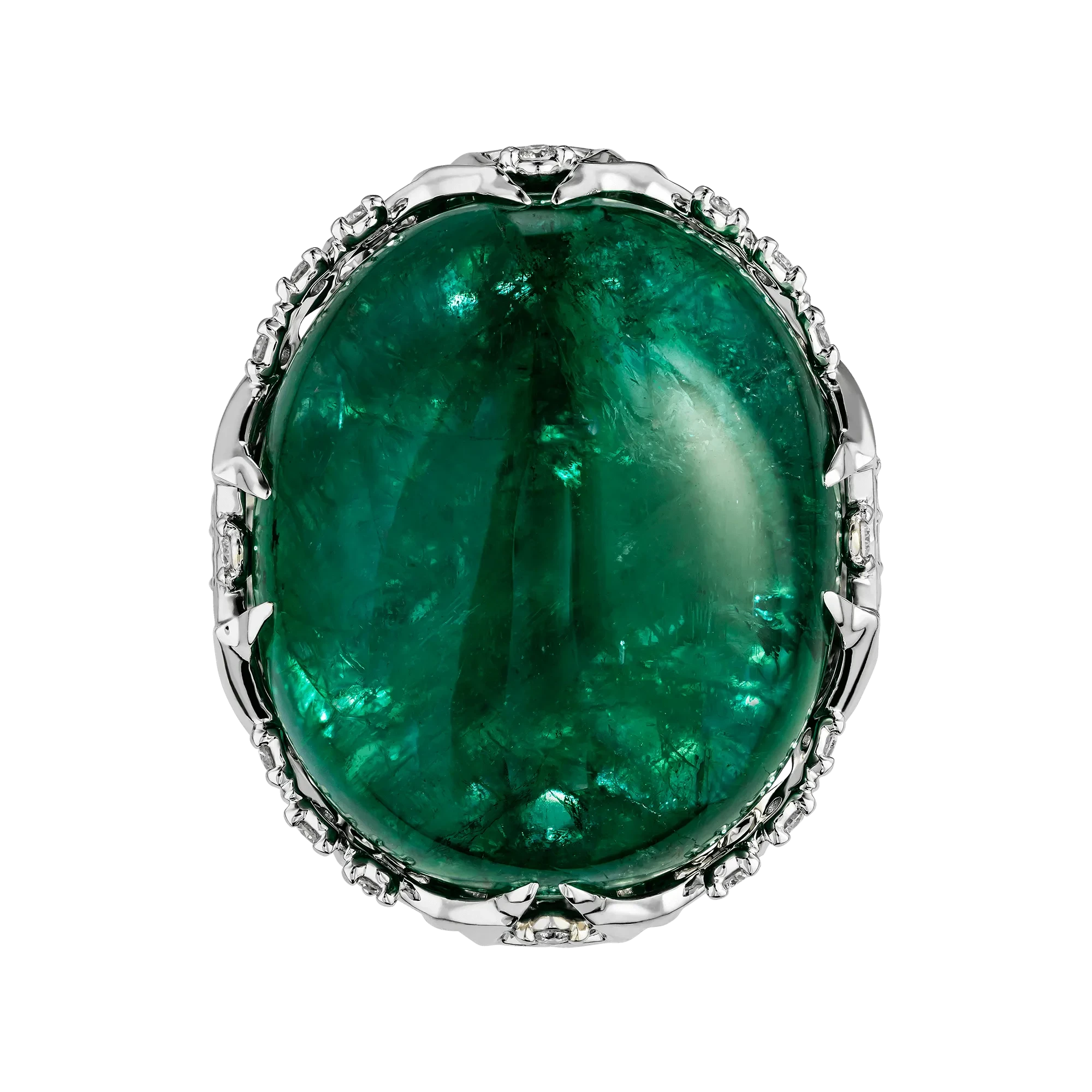 Огранка кабошоном подчёркивает объём и природную органику самоцвета. Через его прозрачность можно заглянуть внутрь: увидеть, как он напитывался хромом, как рождался в недрах земли под давлением, светом и временем. Он не скрывает свою суть – напротив, демонстрирует её величие.