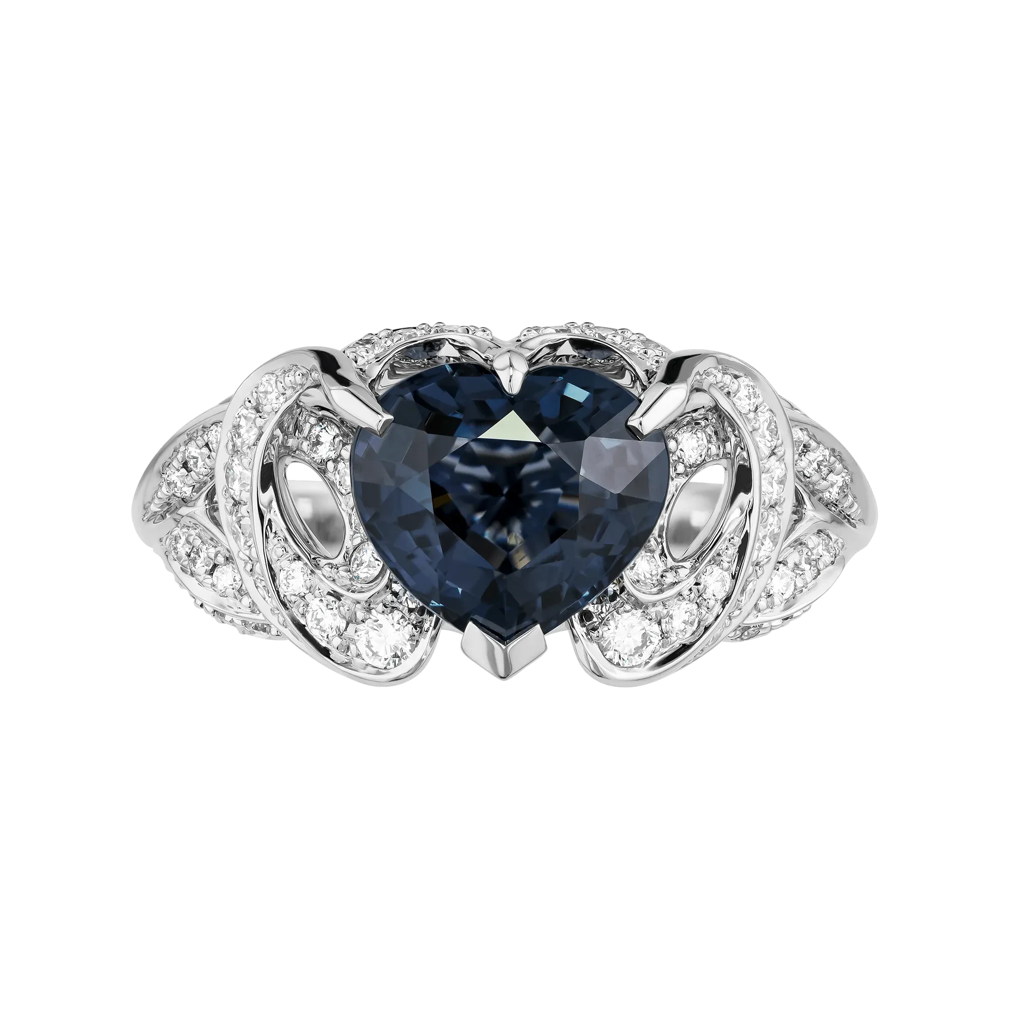 В центре композиции — благородная шпинель редкого черничного оттенка весом 2,83 карата. Её глубокий цвет воспринимается как состояние: сдержанное, собранное, наполненное внутренней силой. Огранка в форме сердца здесь не буквальна — она становится знаком единения, в котором важна не демонстрация эмоций, а их подлинность и равновесие. Природное происхождение самоцвета подтверждено международным сертификатом GFCO GEM LAB (Швейцария), подчёркивающим ценность камня не только эстетическую, но и смысловую.