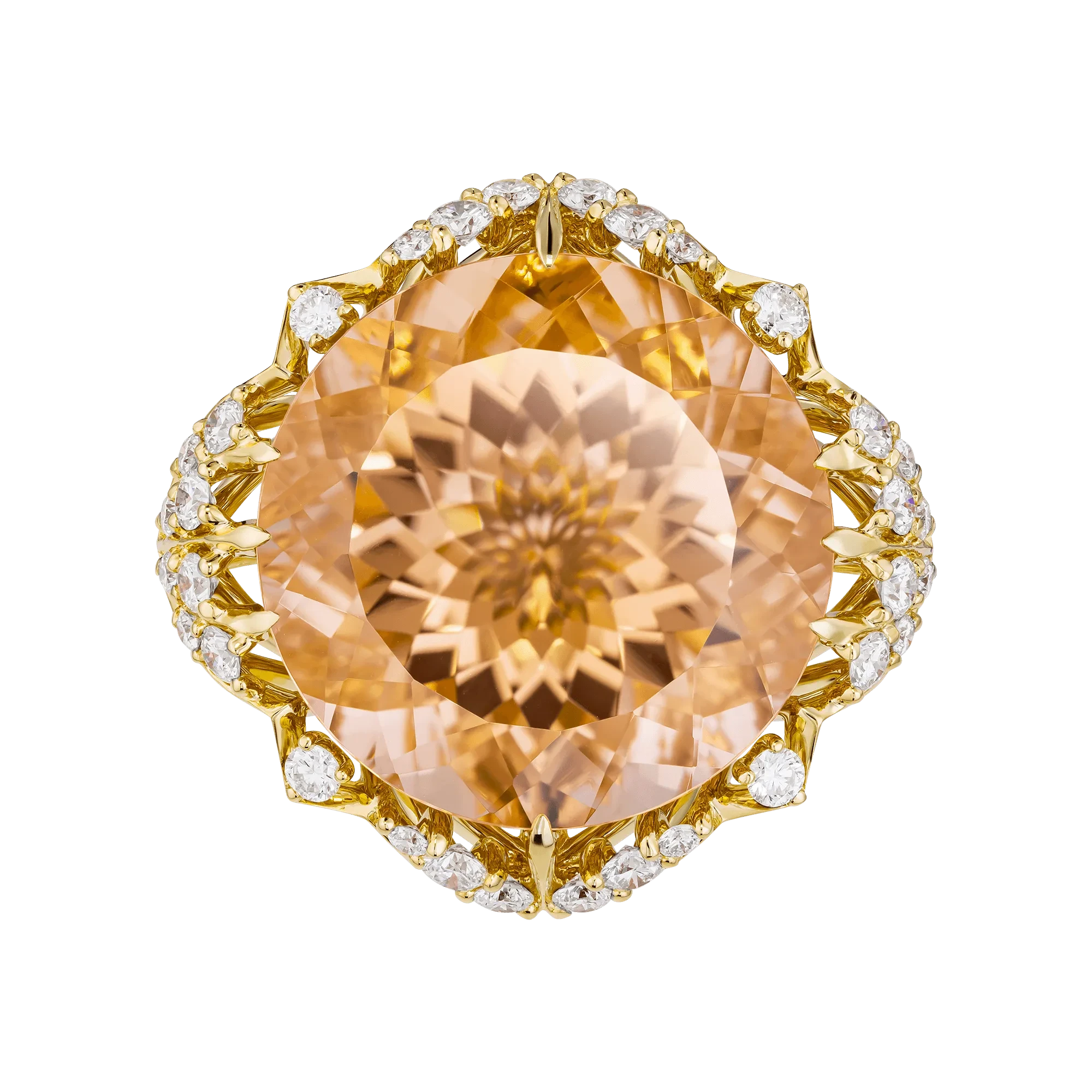 Жёлтое золото оправы в окружении россыпи бриллиантов становится сияющим фоном, на котором самоцвет раскрывает всю свою воздушность. Бриллианты словно создают ореол вокруг морганита, усиливая впечатление парящего света и бесконечной гармонии.