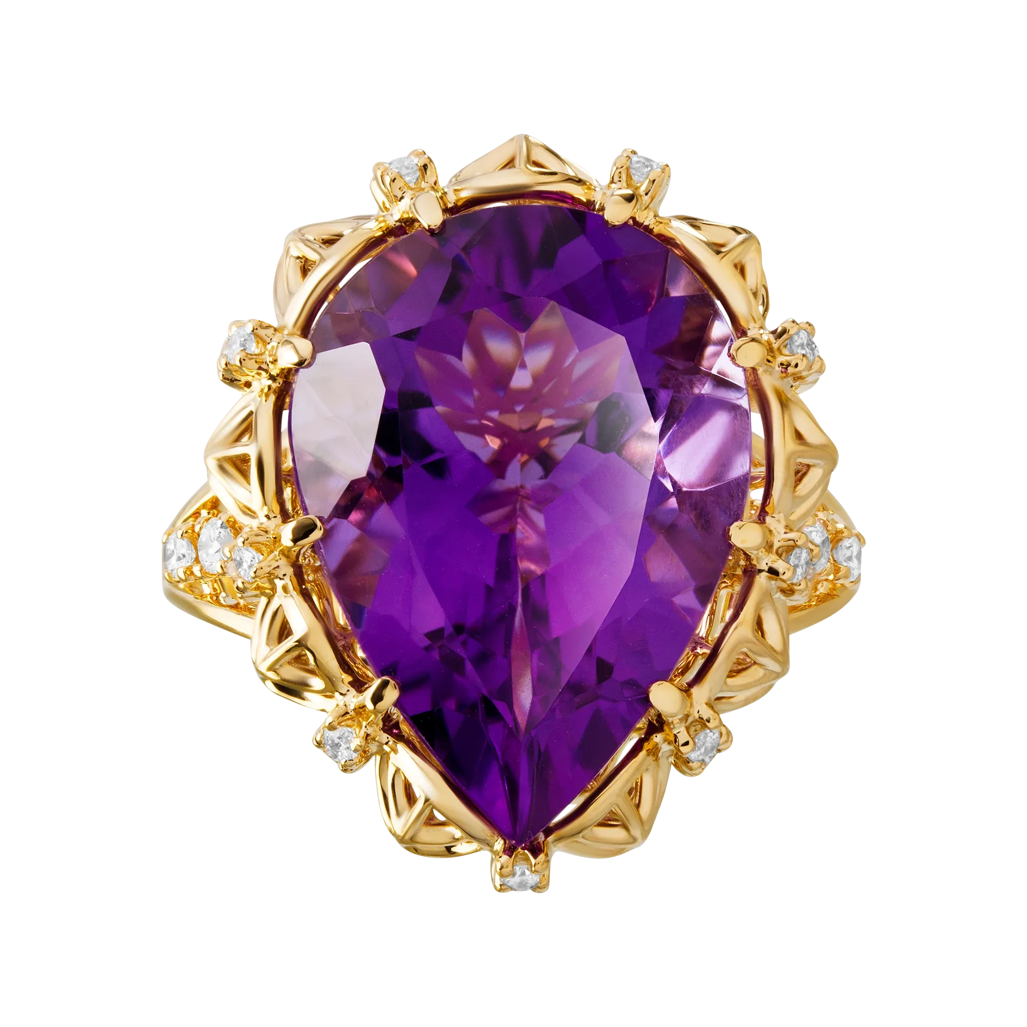 Довершившись опыту и собственному творческому видению, дизайнеры превратили крупный аметист в главную кульминацию ажурного кольца.