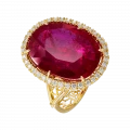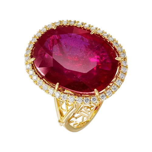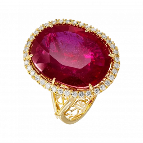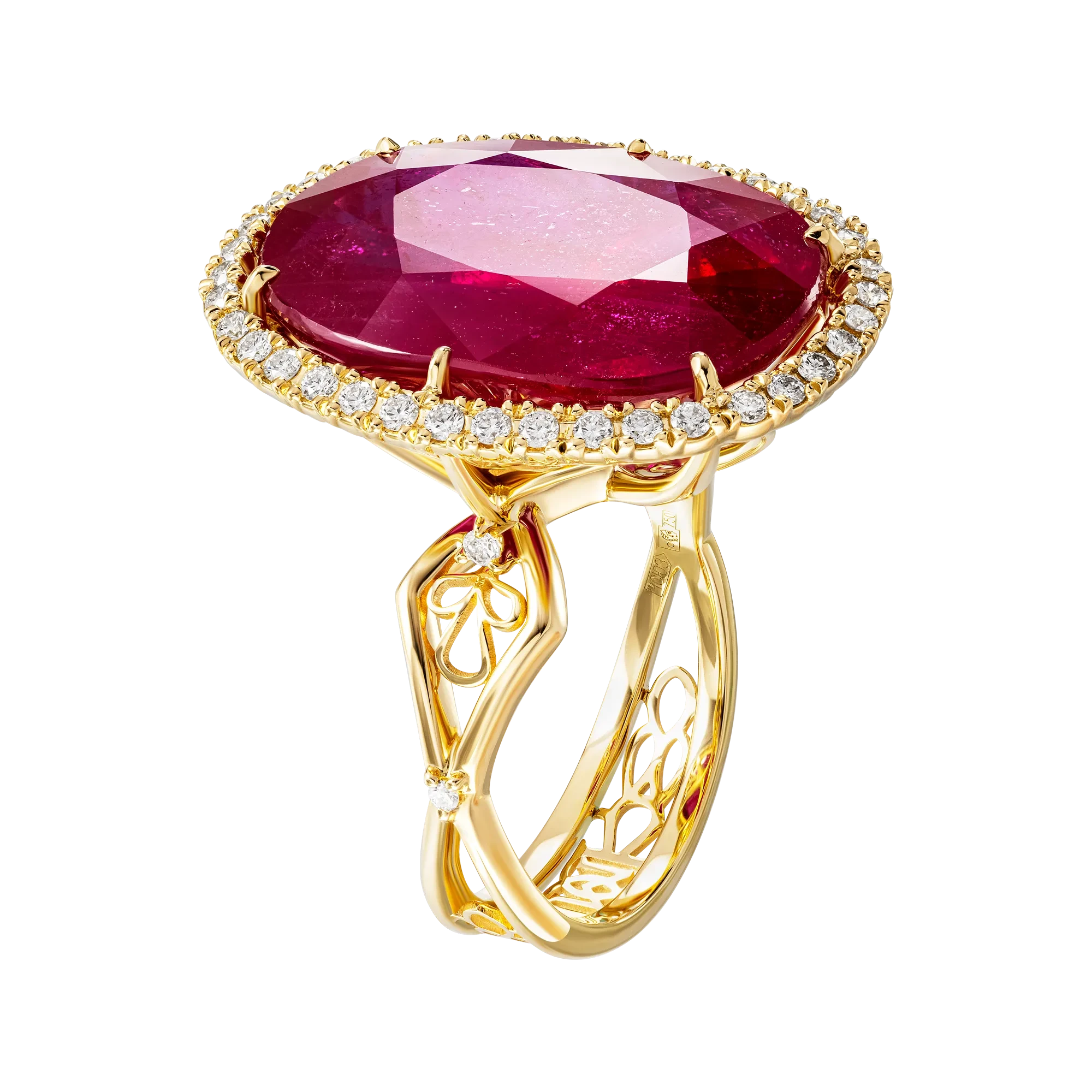 Притягательным центром фееричного эксклюзива, элегантно вплетенным в ажур оправы из желтого золота, стал крупный рубин, чья виртуозная огранка подчеркивает все его природные достоинства: сияющую чистоту, насыщенную глубину и пламенную суть.