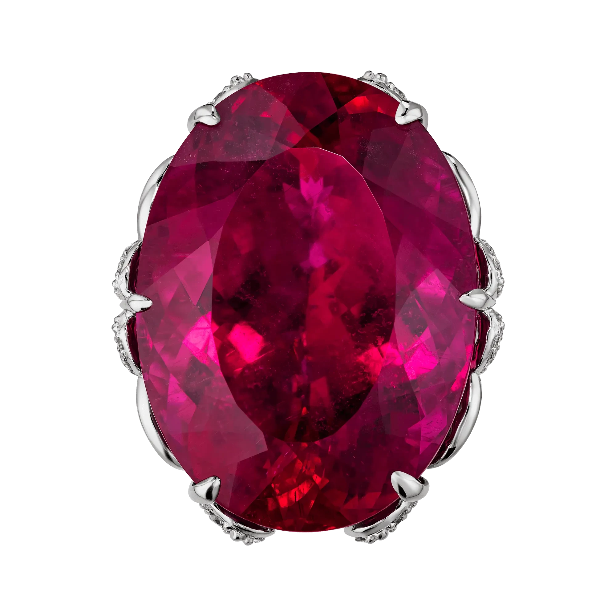 Кольцо «Огненная держава» создано как современная регалия, достойная императорских сокровищниц. В центре композиции сияет редчайший рубеллит весом 51,42 карата из Бразилии – драгоценный камень, который по своим характеристикам и масштабу можно отнести к категории подлинных ювелирных реликвий. Его насыщенный пурпурно-алый оттенок символизирует власть, духовное могущество и вечный огонь, питающий силу династий и преемственность поколений.
