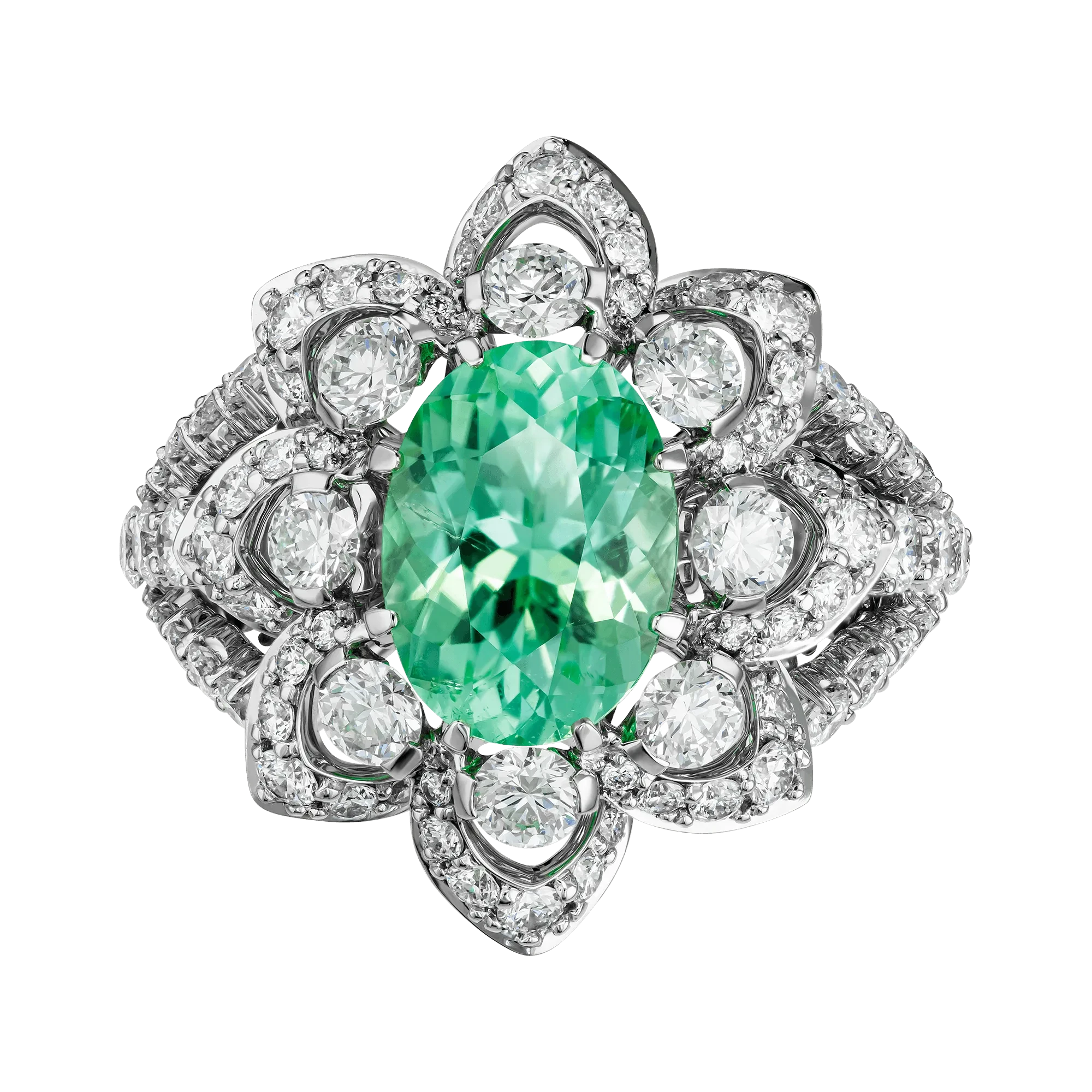 В центре композиции – редчайший турмалин Параиба из Мозамбика весом 2,90 карата. Драгоценные камни такого качества принадлежат к числу наиболее востребованных в мире – их добыча крайне ограничена, а уникальная окраска обусловлена присутствием меди и марганца, создающих эффект живого люминесцентного свечения. Оправа из белого золота, полностью выложенная бриллиантами, подчеркивает уникальный цвет Параибы, превращая кольцо в классическое произведение, достойное семейной коллекции.