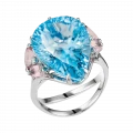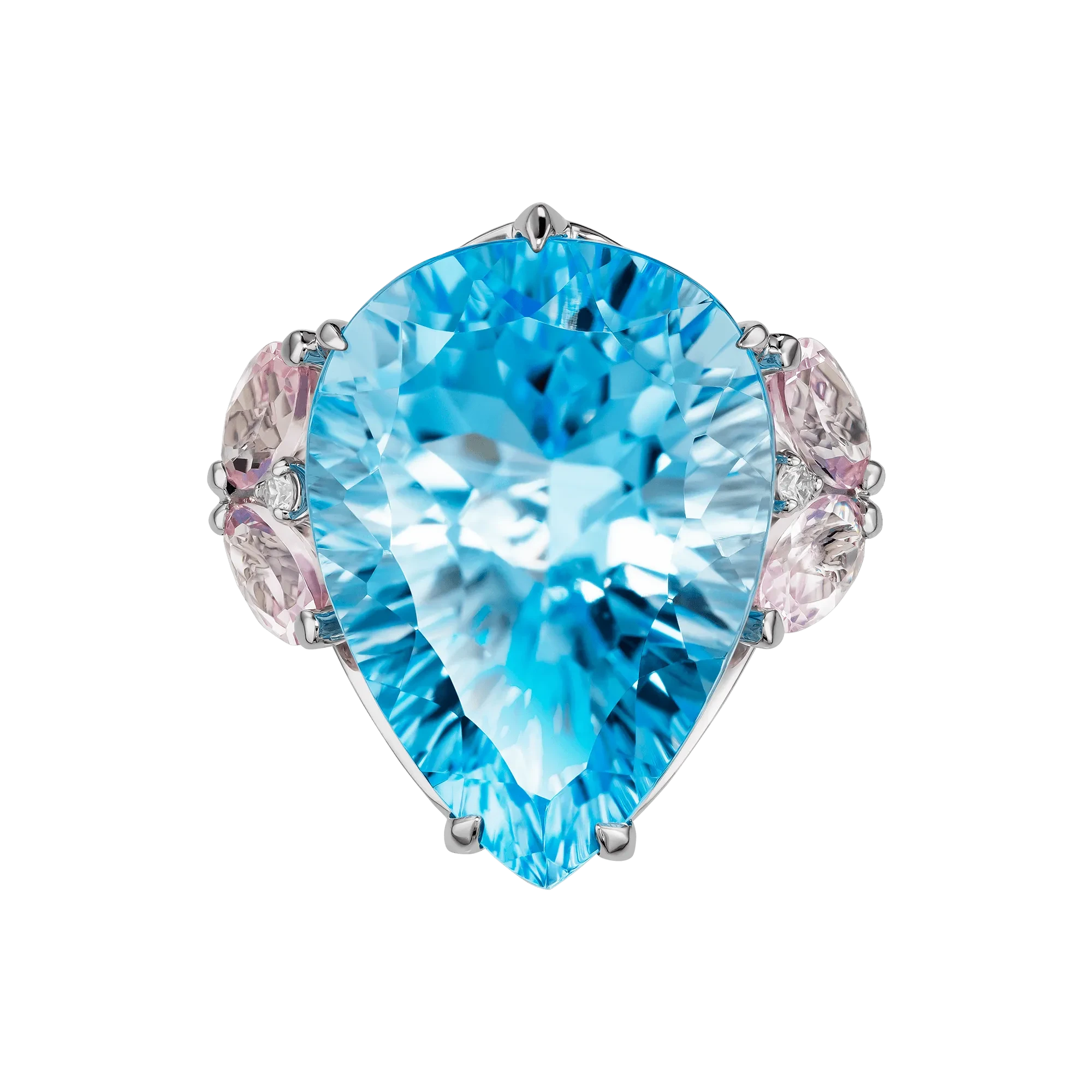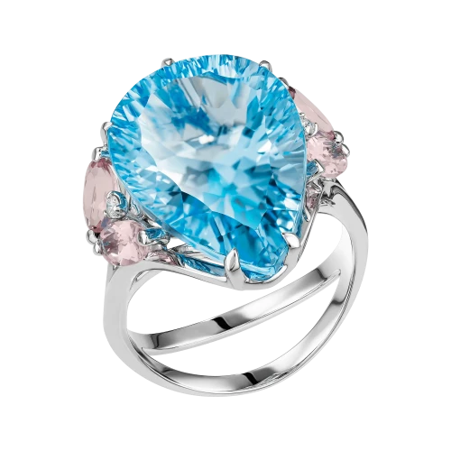 Центральным акцентом композиции стал крупный бразильский топаз огранки «капля» с насыщенным, чистым голубым оттенком. Его цвет обладает высокой световой плотностью и прозрачностью, благодаря чему камень кажется наполненным глубиной и движением. Холодная ясность топаза подчёркнута нежно-розовыми морганитами, чья мягкая, почти акварельная тональность вводит в композицию тепло и визуальную паузу. Это сочетание работает не контрастом, а тонкой цветовой настройкой — редким приёмом, требующим безупречного чувства меры.