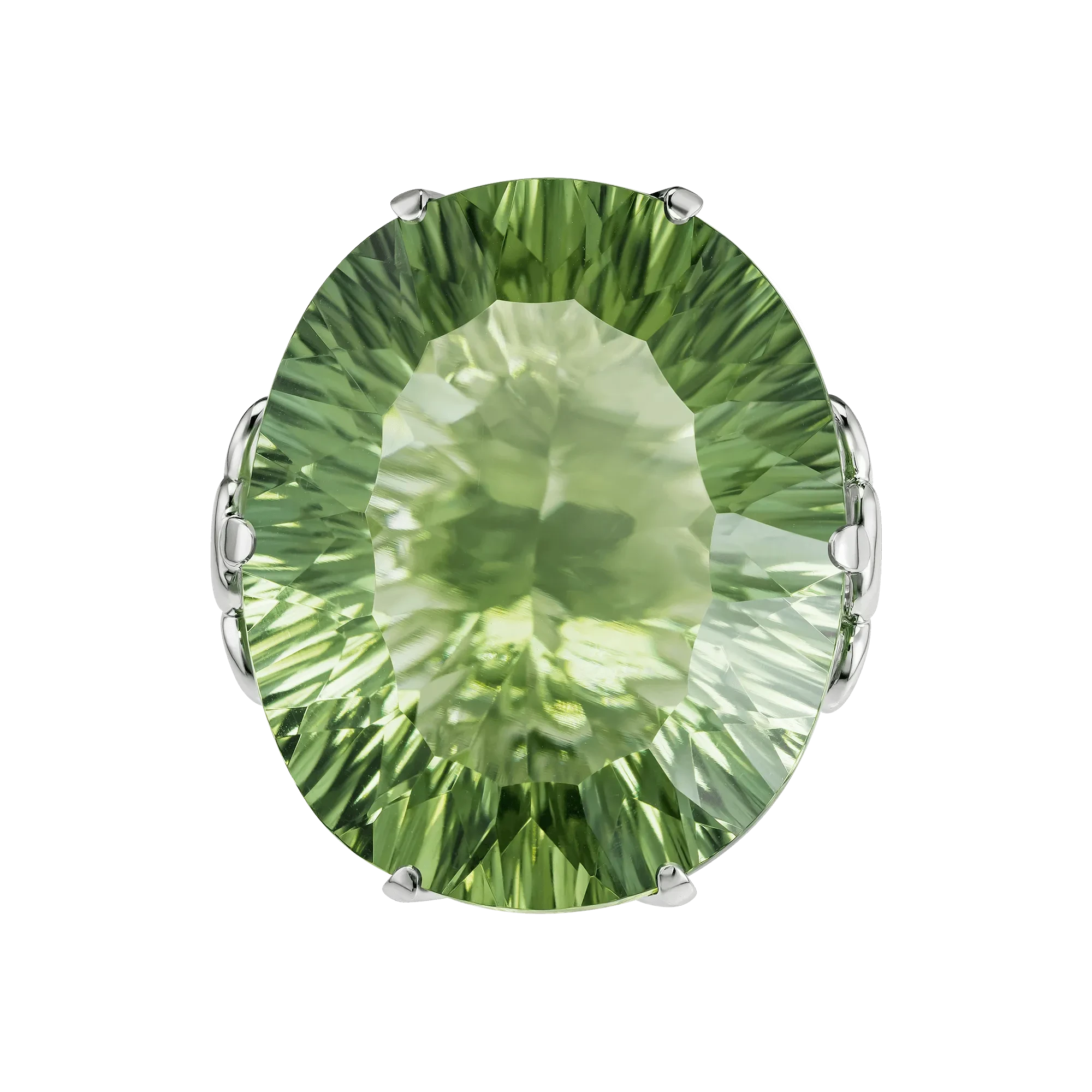 В центре композиции — крупный празиолит, разновидность кварца, ценимая за чистоту кристалла и мягкий зелёный оттенок с холодным мятным подтоном. Камни высокого качества отличаются равномерным цветом и высокой прозрачностью, позволяющей свету проходить сквозь грани свободно и глубоко. Благодаря особой огранке празиолит в этом кольце демонстрирует лучистую игру, создавая эффект внутреннего сияния без резких контрастов.