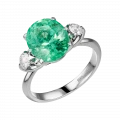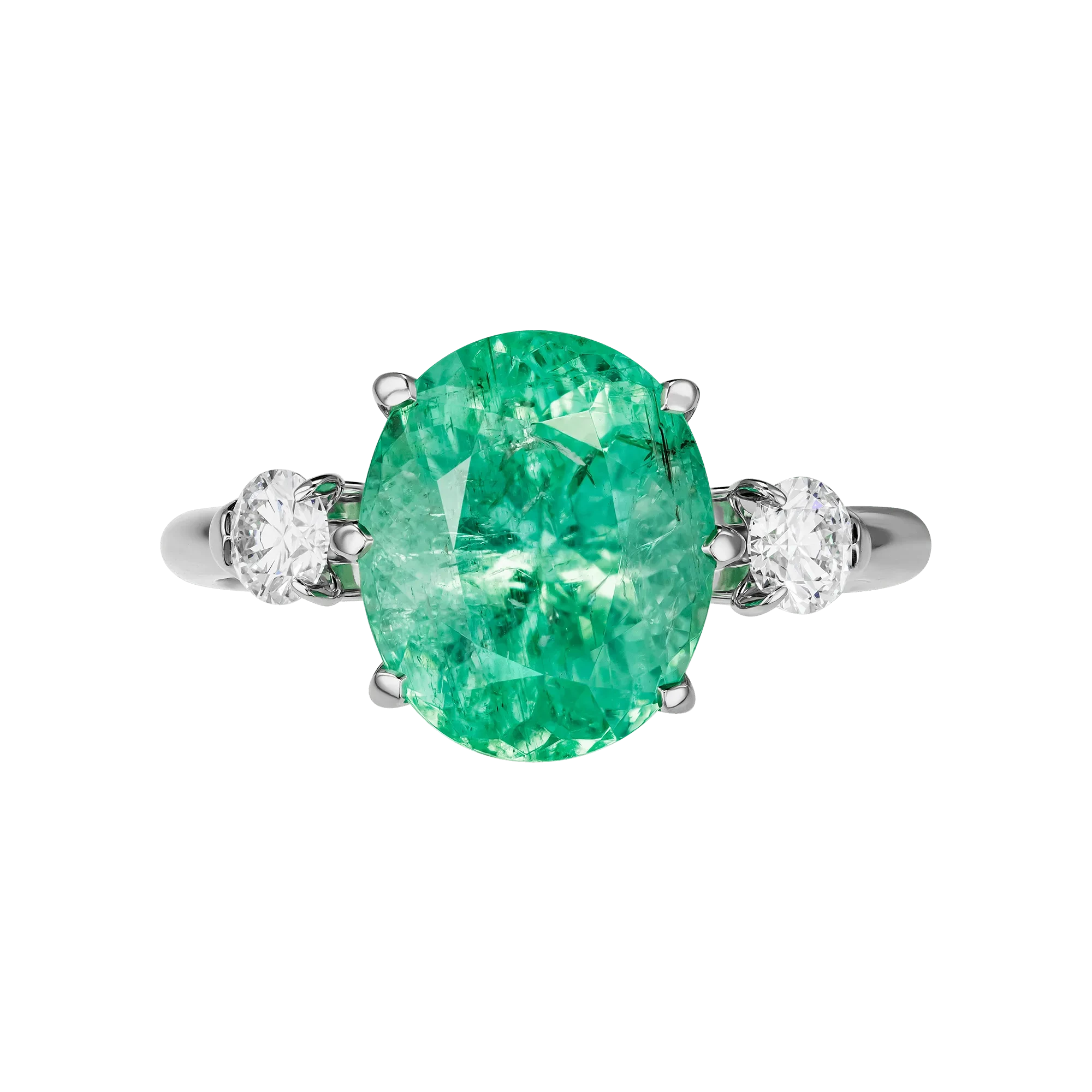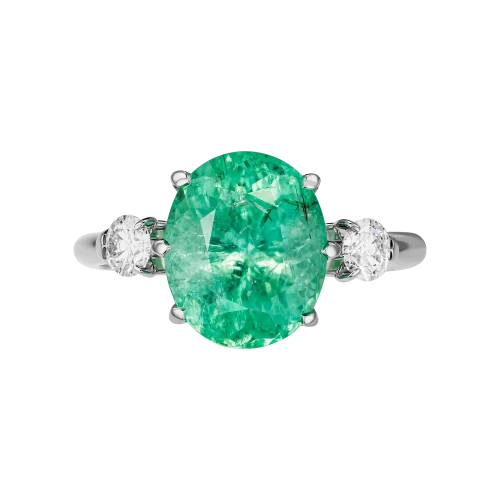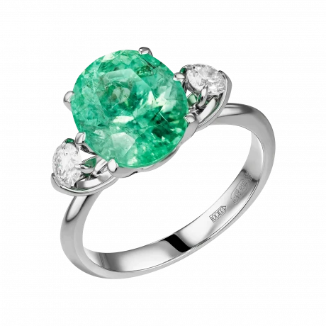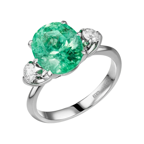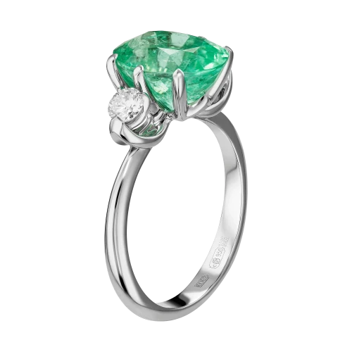 Платиновая оправа, дополненная двумя бриллиантами по бокам, словно создаёт гармонию звуков в драгоценной симфонии, где каждый штрих подчеркивает статус и силу центрального камня. Чистота линий и благородный блеск металла усиливают сияние Параибы, раскрывая всю глубину её чарующего свечения.