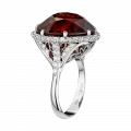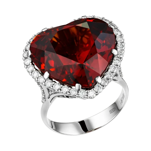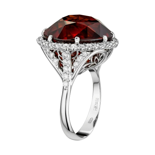 Ореол из чистейших бриллиантов обрамляет природный огонь спессартина холодной россыпью света, усиливая контраст и подчёркивая его редкую красоту. Оправа из белого золота поддерживает композицию своей архитектурной ясностью, создавая гармонию между теплом центра и благородной прохладой металла.