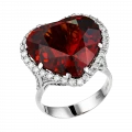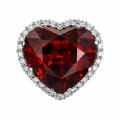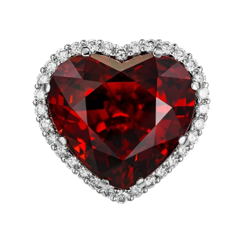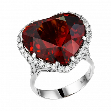 В центре композиции – впечатляющий спессартин весом 30,57 карата, огранённый в форму сердца. Камень обладает уникальной оптической динамикой: он словно загорается изнутри при каждом движении, раскрывая новые слои цвета. Такой эффект называют «мандариновым огнём» – редким признаком минералов исключительной категории.