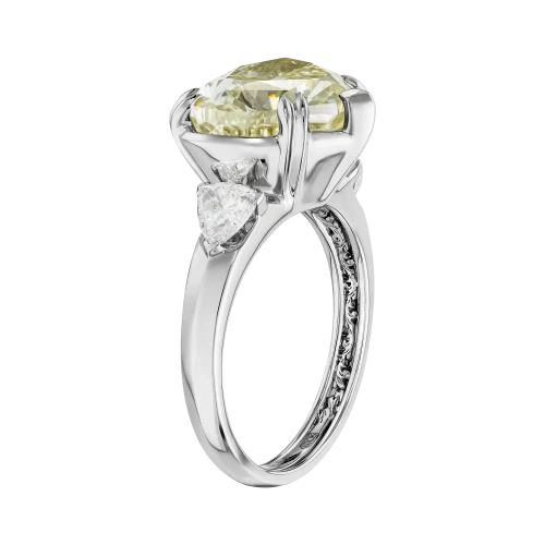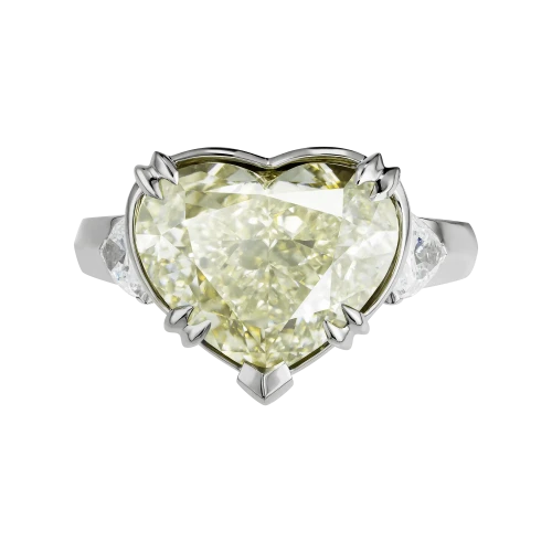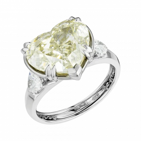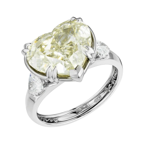 По обе стороны от центрального бриллианта расположены два камня-акцента, деликатно поддерживающие композицию. Лаконичная оправа из белого золота сохраняет баланс между выразительностью и строгостью, подчёркивая масштаб и форму главного самоцвета. «Биение сердца» — это украшение о подлинности чувств, где редкость цвета, вес и огранка соединяются в едином, сильном и запоминающемся образе.