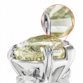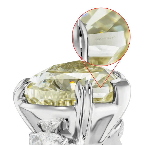 Центральный камень отличается сложной фантазийной окраской с переливами жёлтых, оливковых и тёплых коньячных оттенков. Такая природная палитра встречается нечасто и формируется под влиянием уникальных геологических условий. При движении света внутри кристалла возникает живая игра бликов, создающая эффект пульсации — будто драгоценный камень откликается на ритм сердца. Природное происхождение и характеристики бриллианта подтверждены международным сертификатом GIA — признанным мировым стандартом оценки по системе 4C (carat, color, clarity, cut).