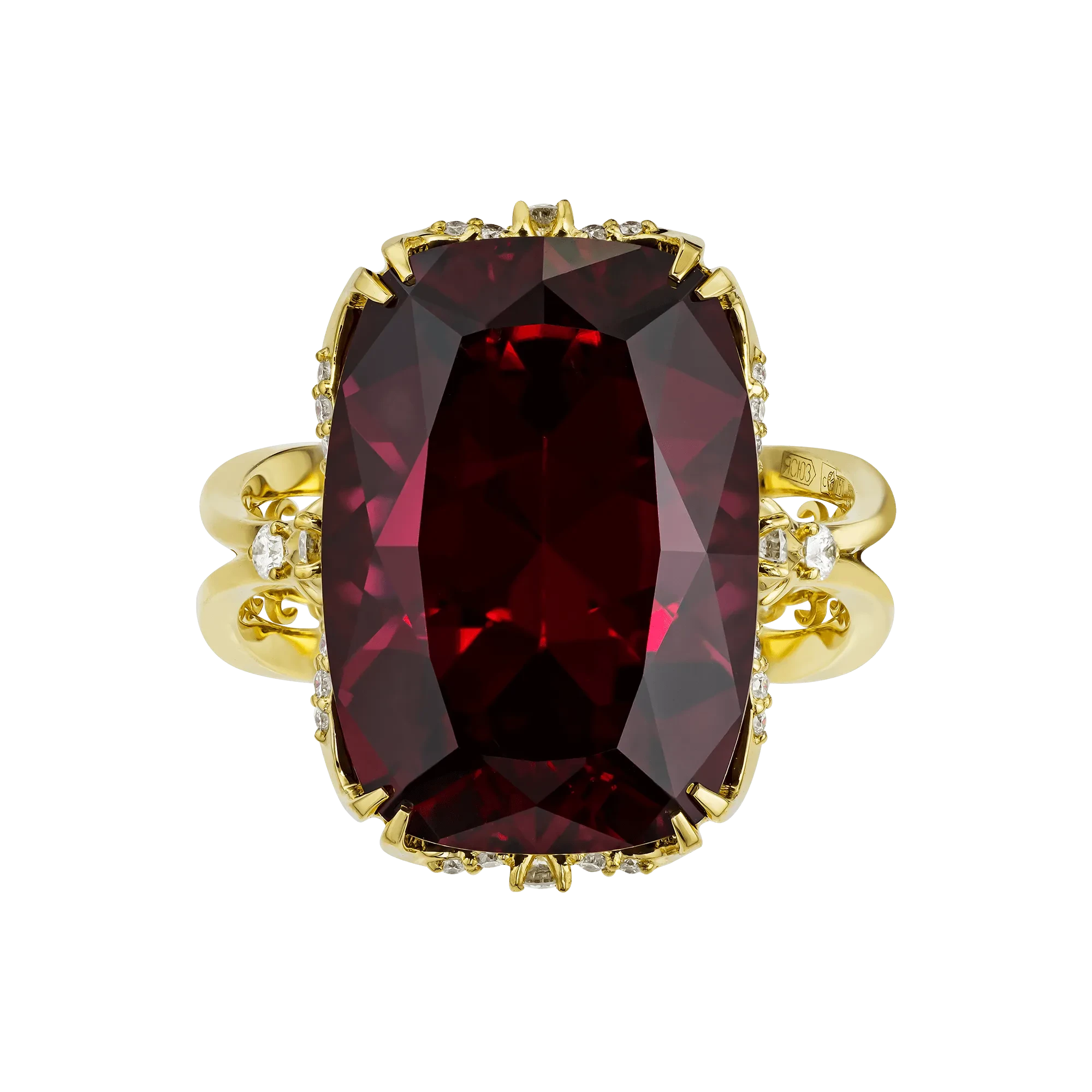 Жёлтое золото оправы усиливает природную теплоту самоцвета и создаёт ощущение цельности образа. Архитектура кольца выстроена уверенно и точно: форма подчёркивает масштаб центрального камня, а бриллианты добавляют выверенные световые акценты, словно фиксируя движение цвета.