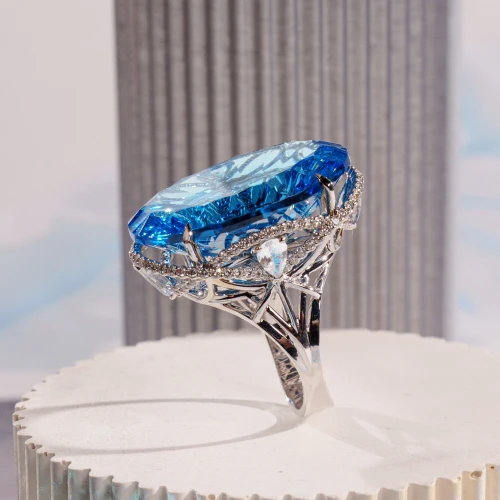 В сердце украшения возвышается редкий крупный топаз весом 49,38 карат, чья насыщенная голубая палитра напоминает о загадках звёздной ночи. Камень окружён сверкающими бриллиантами, рассыпанными словно драгоценные звёзды, которые подчёркивают его магнетическое сияние и глубину.