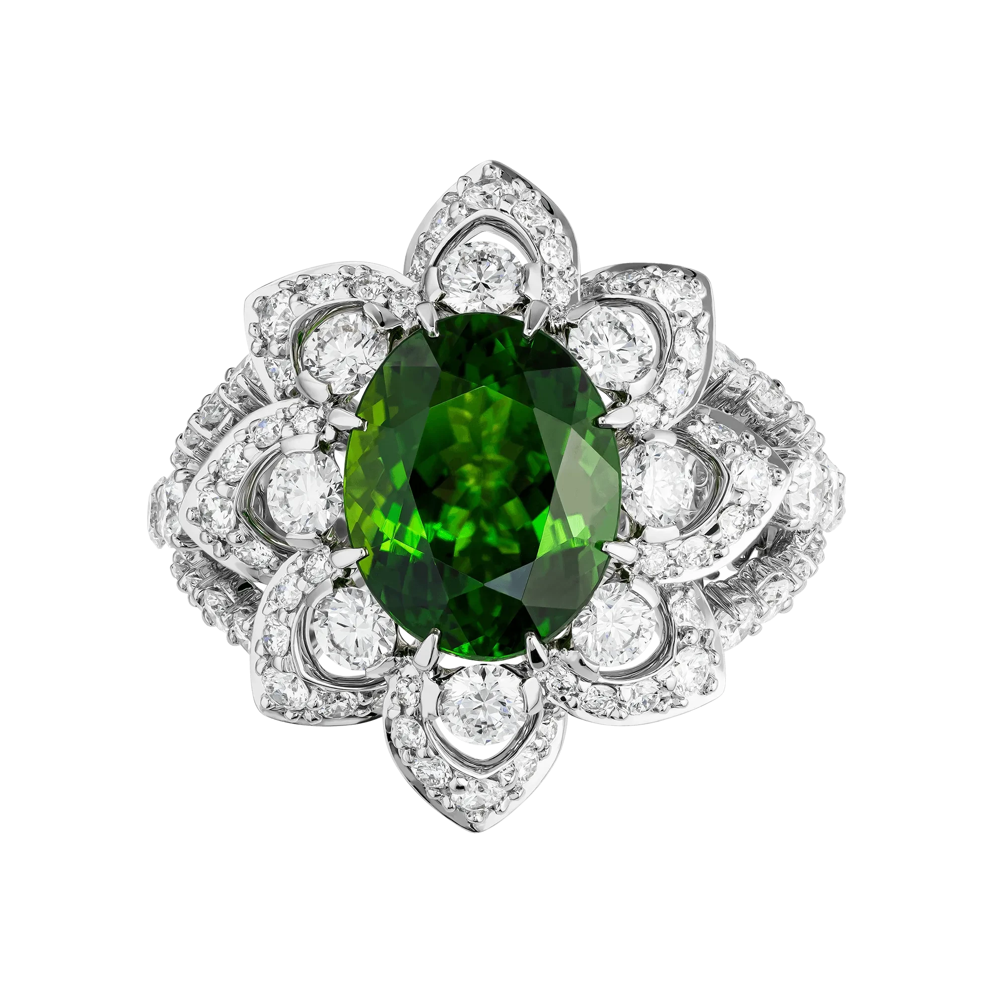 Цветочная стилистика кольца подчёркивает идею раскрытия формы. Ажурная оправа из белого золота, инкрустированная россыпью бриллиантов, формирует деликатный световой ореол вокруг центрального камня. Их холодное сияние усиливает контраст и акцентирует внимание на насыщенности хромтурмалина, позволяя природной выразительности камня звучать в полной мере.