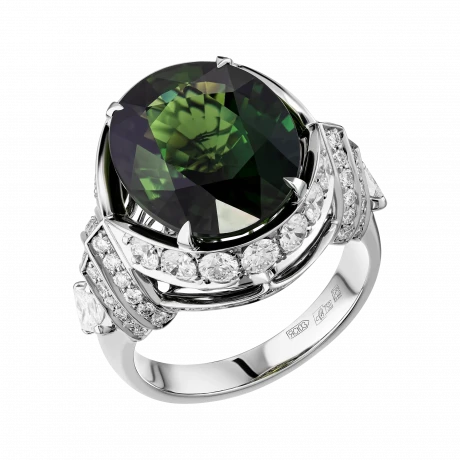 В центре сдержанной композиции – редкий зелёный сапфир весом 10,18 карат, привезённый из Таиланда. Среди корундов такой оттенок – исключение: глубокий, почти аристократичный. Он не стремится покорить – он утверждает.