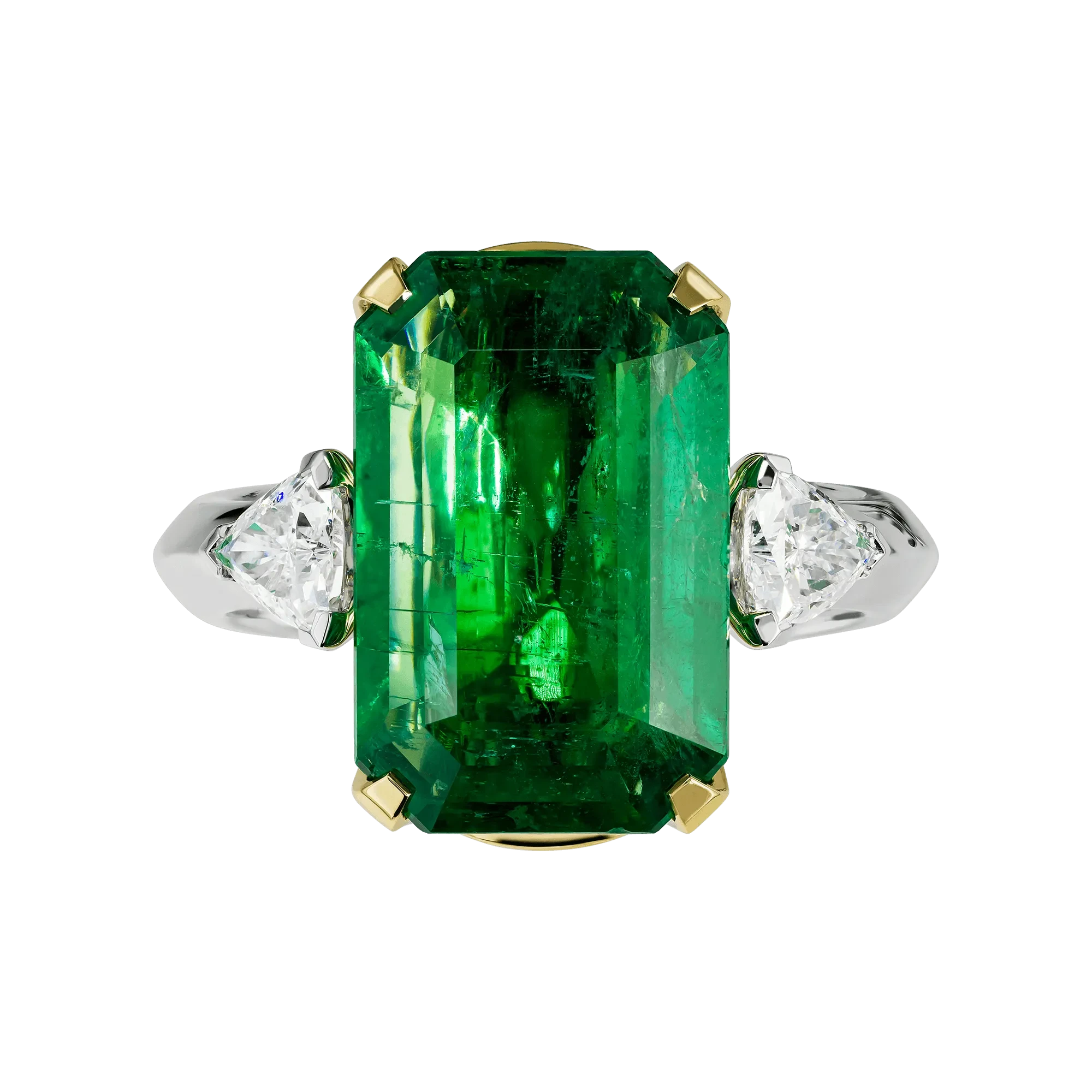 Жёлтая оправа центрального камня подчёркивает глубину его оттенка и усиливает ощущение тепла, тогда как основная часть кольца выполнена из белого золота, формирующего выверенный контраст между изумрудом и бриллиантами-спутниками. Их холодное сияние задаёт чёткую архитектуру формы и придаёт композиции равновесие и завершённость.