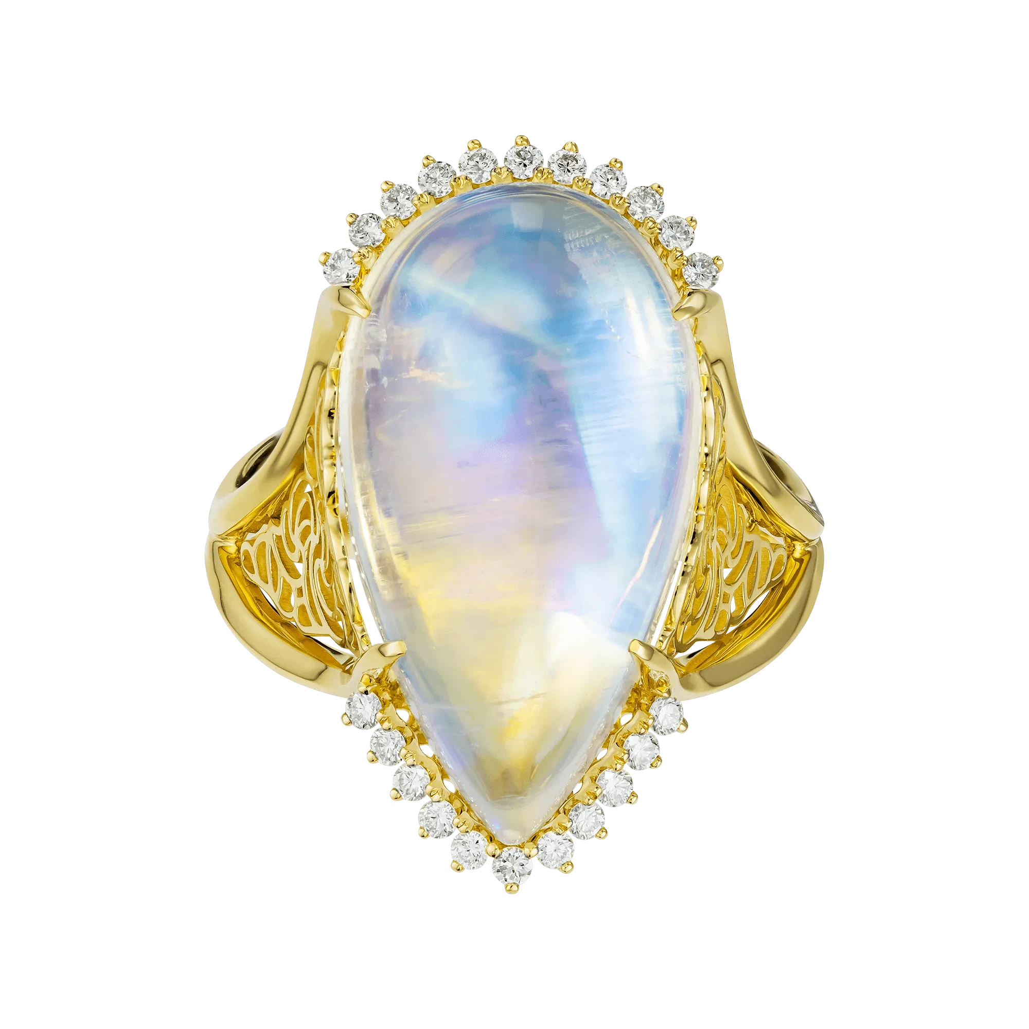 Россыпь бриллиантов, окружающих камень, образует тонкий полукруг света – как след от лунной дорожки на спокойной воде. Ажурная оправа из жёлтого золота выполнена в манере восточных ремесленников: её орнаменты напоминают узоры старинных индийских резных павильонов, где каждая линия – символ, каждая прорезь – дыхание пространства.