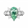 В центре композиции – исключительный турмалин Параиба весом 3,67 карат. Редчайший минерал с неоновым свечением словно заряжён изнутри: его насыщенно-бирюзовый оттенок – это не просто цвет, а импульс, вспышка, эмоция. Огранка в форме вытянутой капли усиливает динамику – создаётся впечатление, будто самоцвет движется сквозь пространство.