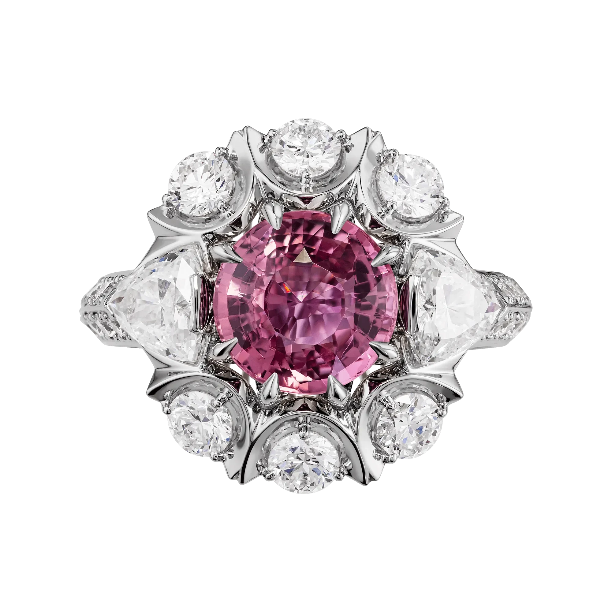 В центре композиции — пурпурно-розовый сапфир весом 2,74 карата, добытый на Мадагаскаре, где природа одаряет камни особой игрой света и глубиной цвета. Его оттенок – сложный и многослойный, как аромат жасмина на вечернем ветру: в нём соединяются прохлада рассвета, тепло заката и едва ощутимая чувственность мгновения. Оправа из белого золота, усыпанная бриллиантами, раскрывается, словно цветок, встречающий первые лучи солнца, позволяя свету мягко играть на каждой грани.