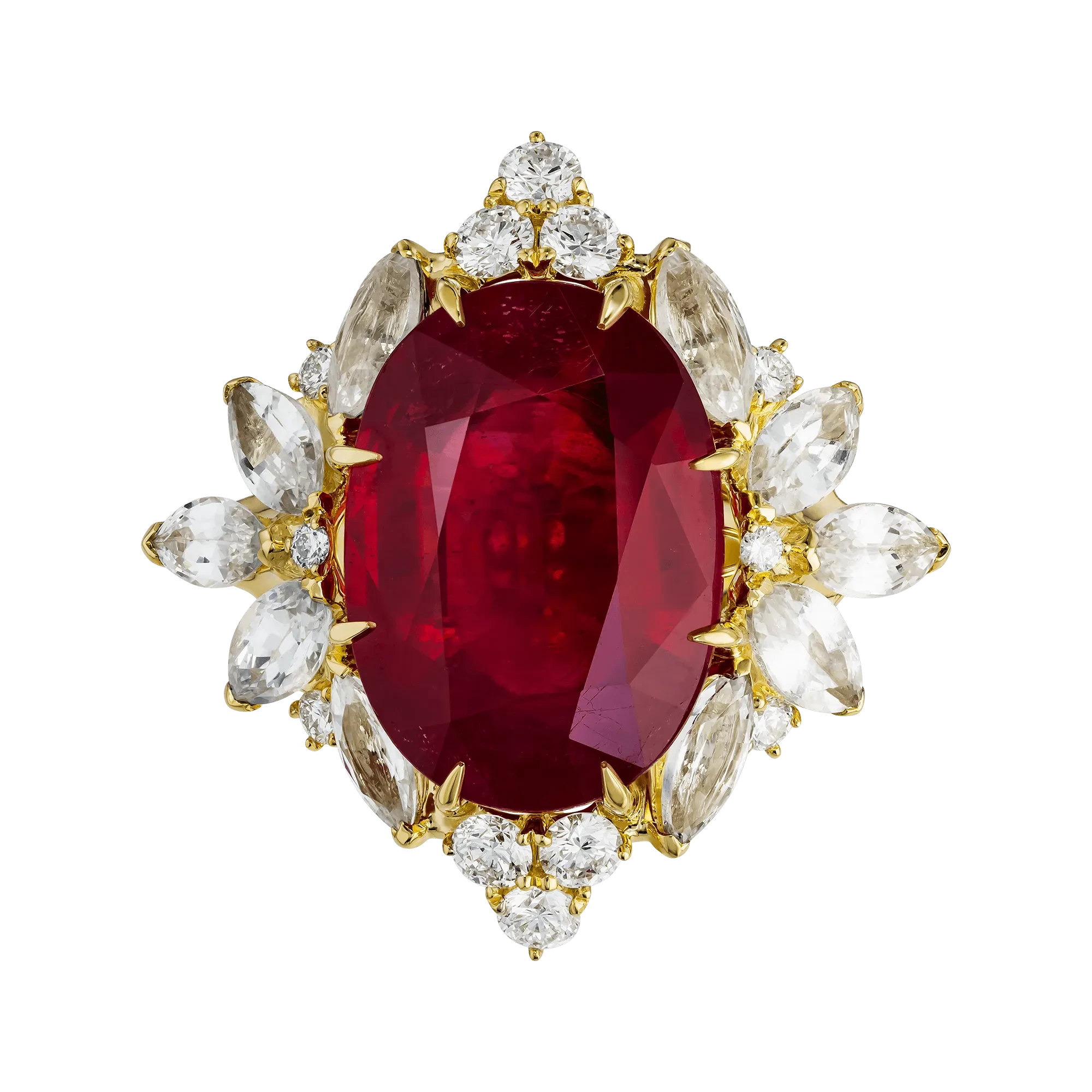 Сияние рубина поддержано тонкой игрой бриллиантов и белых сапфиров, которые отражают свет и усиливают его внутренний огонь. Тёплое жёлтое золото обрамляет композицию, создавая ощущение солнечного прикосновения и подчёркивая силу цвета. Линии кольца текучи и гармоничны, словно повторяют ритм дыхания и биение сердца.