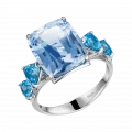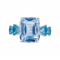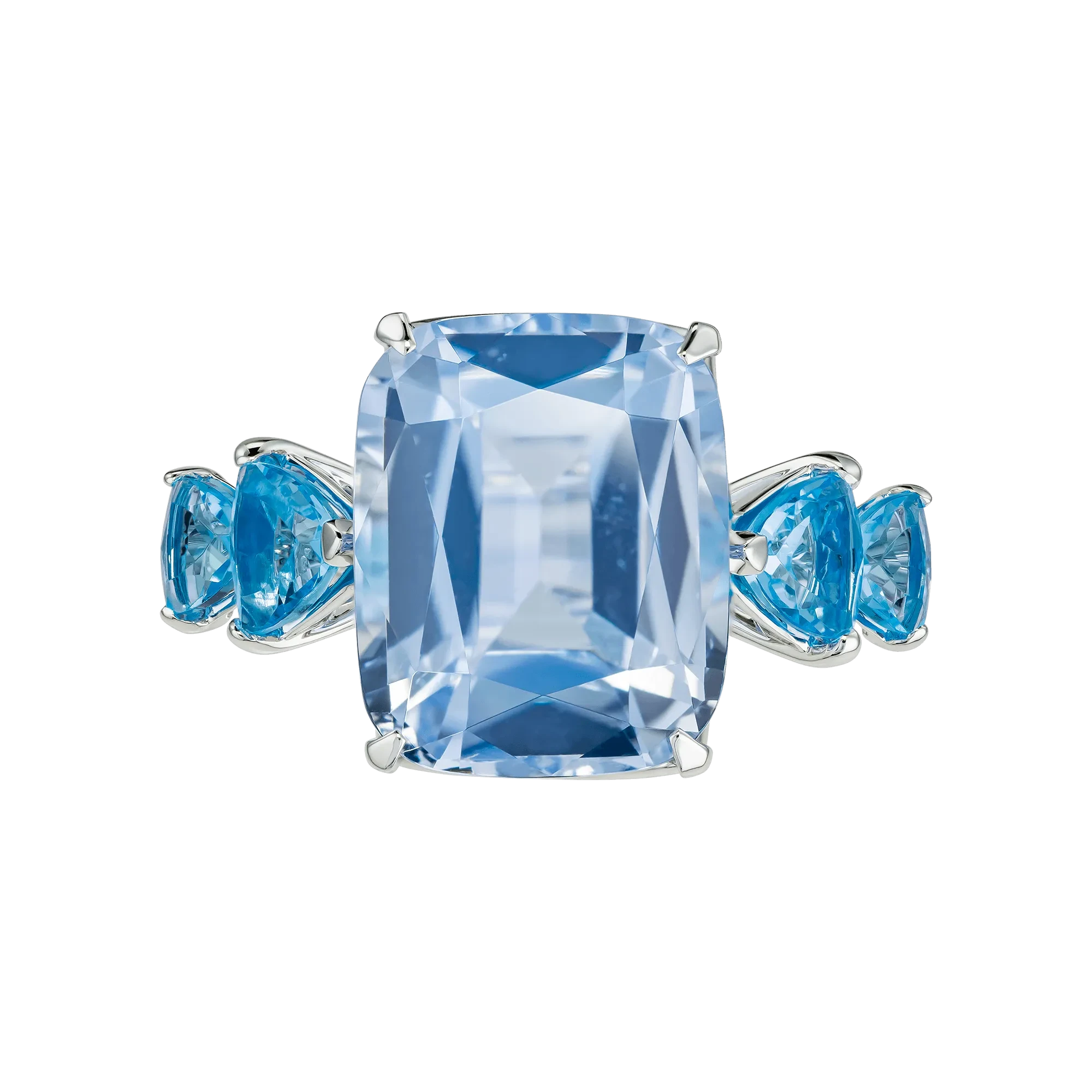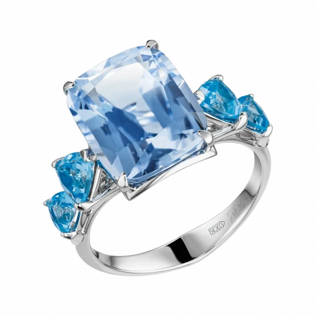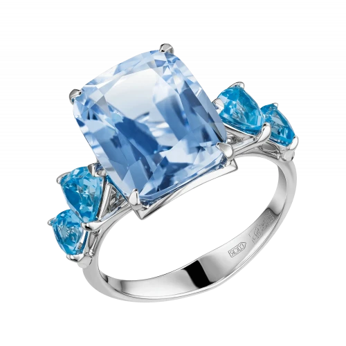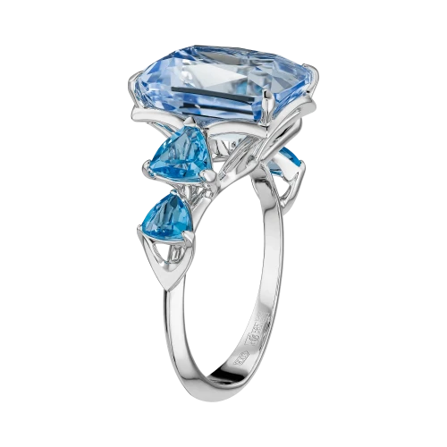 В центре композиции — бразильский аквамарин с чистым, прохладным голубым тоном. Его цвет плавно продолжается в сопровождающих топазах, образуя гармоничную цветовую последовательность без резких переходов. Эта перекличка оттенков создаёт эффект тихого водного каскада, где свет перетекает от камня к камню, сохраняя ощущение цельности и спокойного ритма.