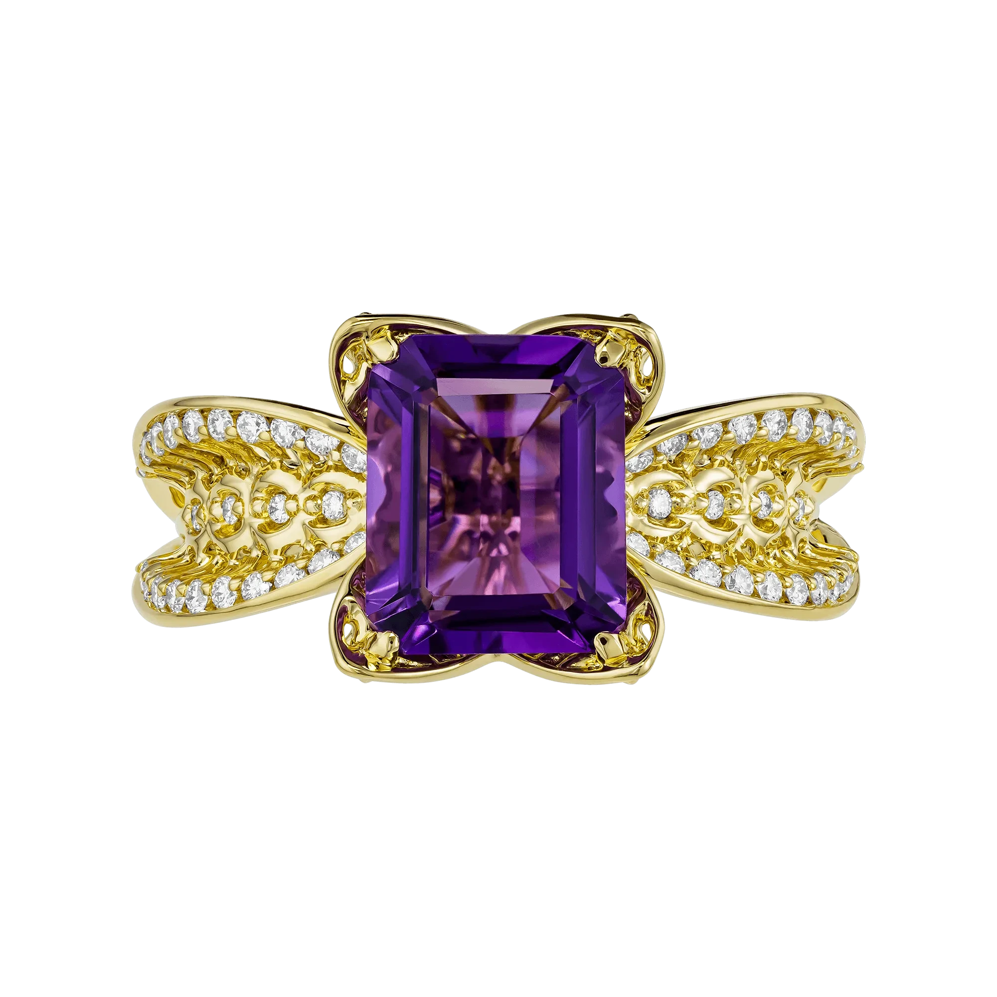 Оправа из жёлтого золота поддерживает центральный камень тёплым сиянием, создавая гармоничный контраст с холодной палитрой аметиста. Бриллианты, рассыпанные по боковым элементам, добавляют деликатное мерцание, словно отражая свет на пути вперёд.