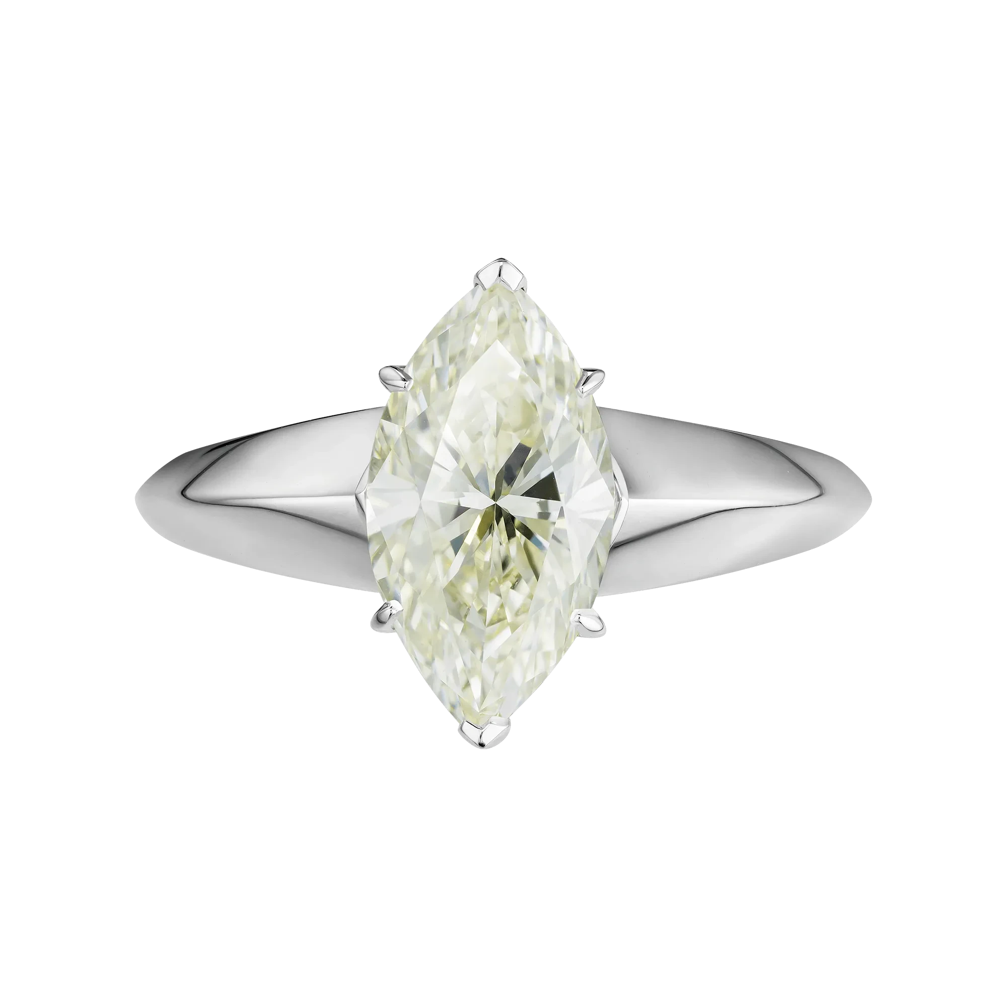Минималистичная оправа из белого золота почти не касается бриллианта, позволяя свету свободно проникать в его грани и раскрывать солнечную игры отражений. Тонко вытянутая шинка плавно поднимается к центральному камню, формируя изящную линию и подчёркивая утончённый характер кольца.