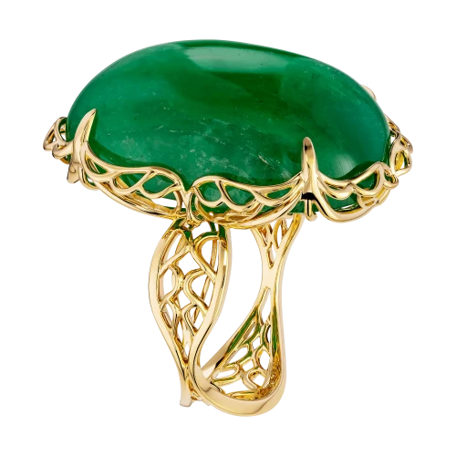 Оправа из жёлтого золота обрамляет камень тонким ажурным кружевом, которое перекликается с формой самого изумруда. Нижняя часть кольца проработана как декоративный купол – архитектурное решение, придающее кольцу объём и изысканность. Такой дизайн отсылает к эпохе высокой ювелирной классики, в которой основное внимание всегда уделяется чувству и символу.