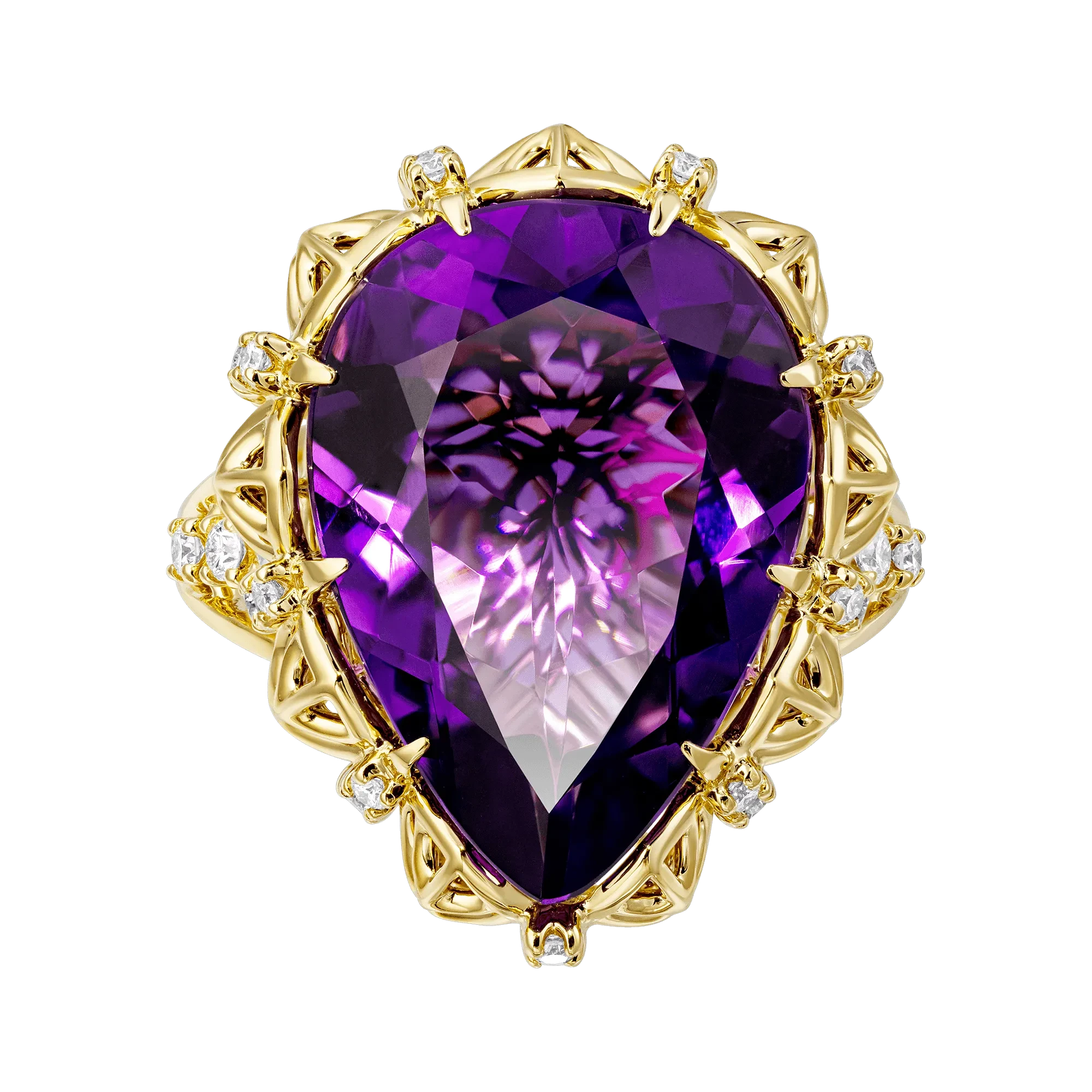 Высокий престиж и красота лилового самоцвета помогли художникам-дизайнерам Maxim Demidov сочинить роскошное кольцо «Магическая значимость». Интересная детализация высокохудожественной оправы позволила мастерам включить в композицию украшения большое количество бриллиантов, идеально подчеркнувших насыщенный цвет и безупречную чистоту центрального кристалла, добытого в Бразилии.