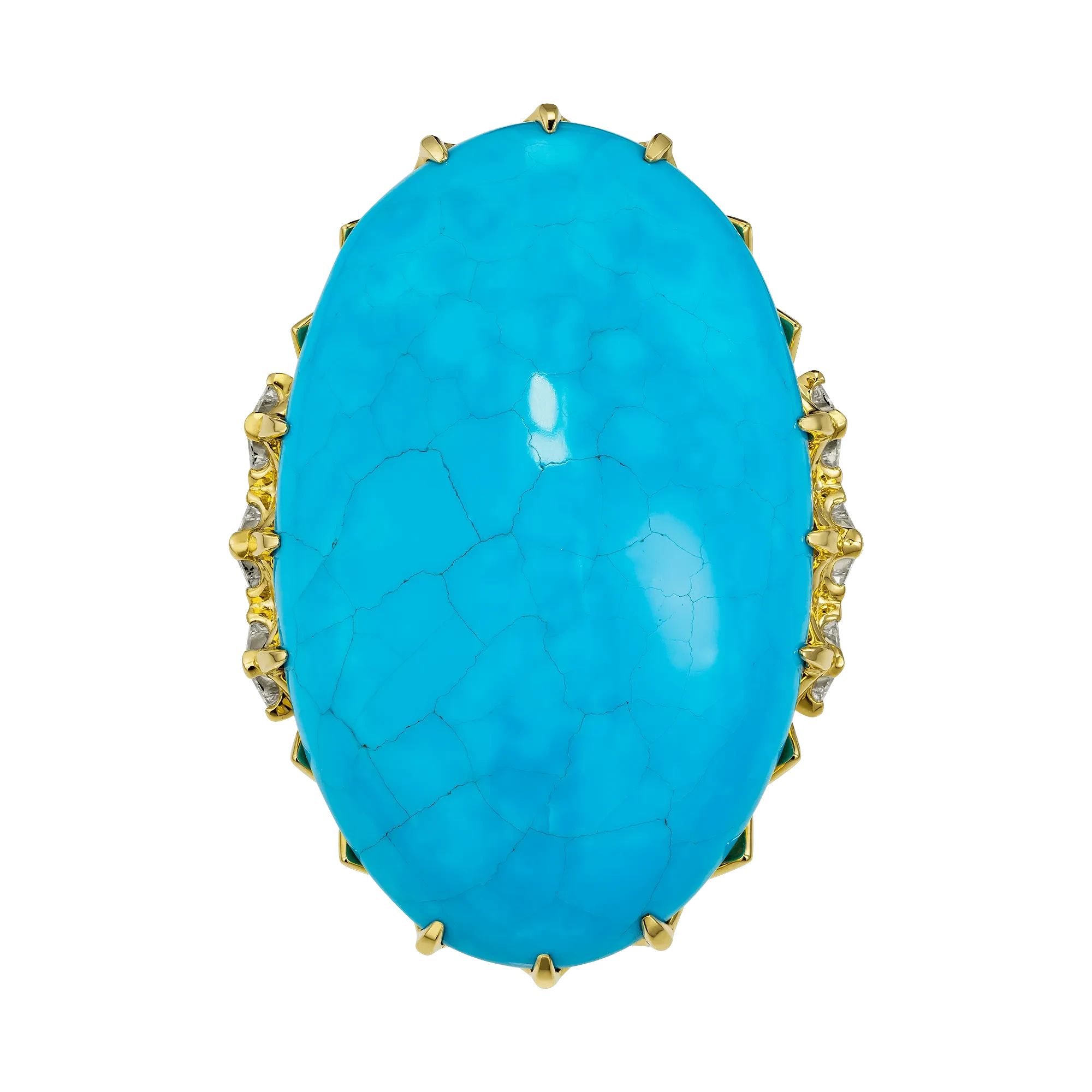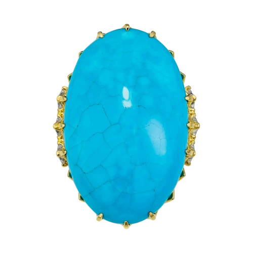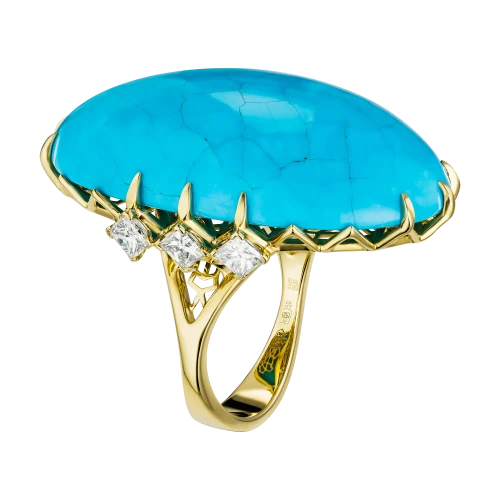 Величественная бирюза из Аризоны весом 44,56 карата стала центром авторского кольца, в котором природа словно оставила свой след – хрупкий узор прожилок, похожий на карту ветров, прочерченную на небесной глади. Этот редкий камень, известный своей неповторимой структурой и насыщенным небесно-голубым оттенком, ценится во всём мире за чистоту тона и природную игру линий, создаваемую самой землёй.