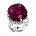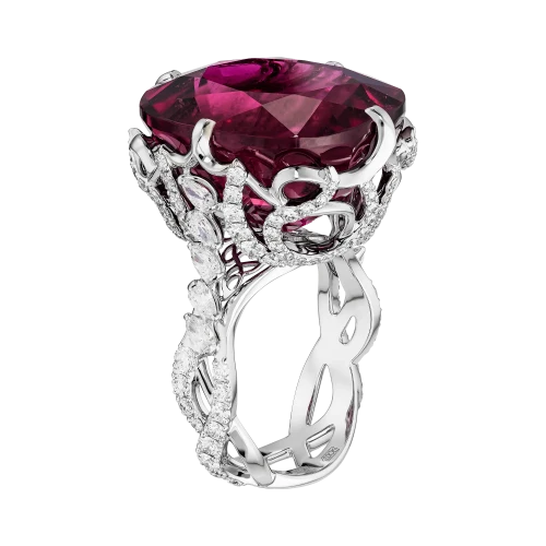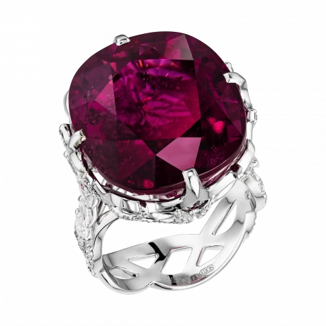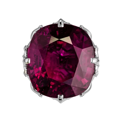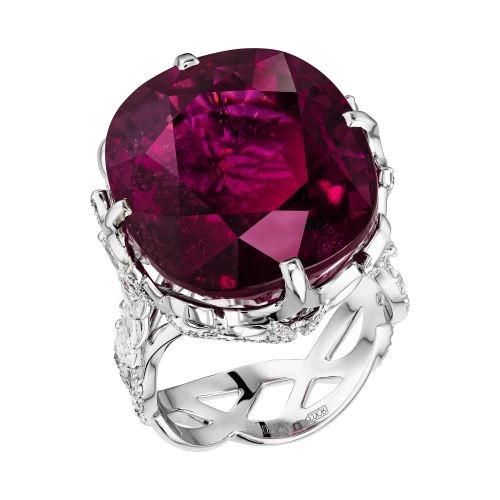 Центральным элементом композиции является редчайший рубеллит весом 33,17 карата, добытый в Мозамбике. Камень отличается высокой насыщенностью цвета и выраженной визуальной плотностью, благодаря чему становится смысловым и композиционным ядром украшения. Происхождение самоцвета подтверждены экспертизой AGL American Gemological Laboratories (Таиланд) — одной из наиболее авторитетных международных геммологических лабораторий, специализирующихся на оценке цветных драгоценных камней.