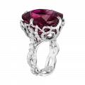 Ажурная оправа из белого золота, инкрустированная бриллиантами, формирует сложную пространственную структуру, направляющую взгляд к центральному камню. Конструкция подчёркивает его доминирующее положение и создаёт ощущение подъёма и концентрации формы. В результате кольцо воспринимается как художественный объект, в котором эмоциональное содержание получает устойчивое материальное воплощение.