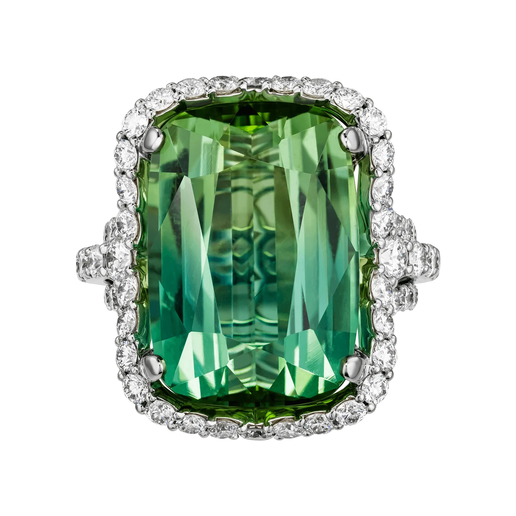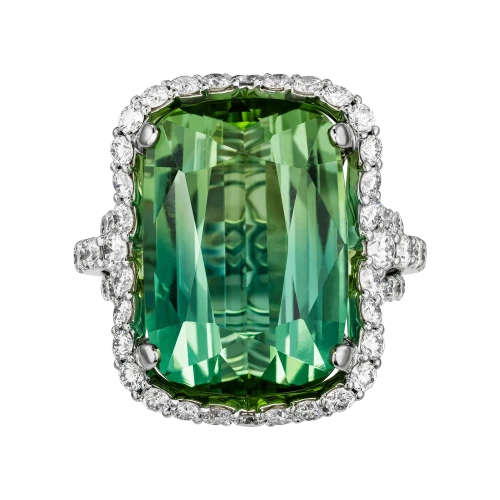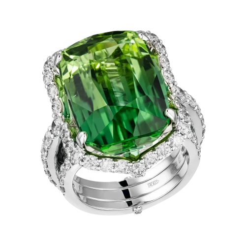 В центре композиции сияет редкий зелёный турмалин весом 24,10 карата, добытый в Конго – земле, где рождаются самые крупные и чистые кристаллы. Его уникальная игра оттенков создаёт иллюзию движения: от насыщенного изумрудного до светлого, почти прозрачного жёлто-зелёного – как если бы в камне застыл живой свет тропического солнца.