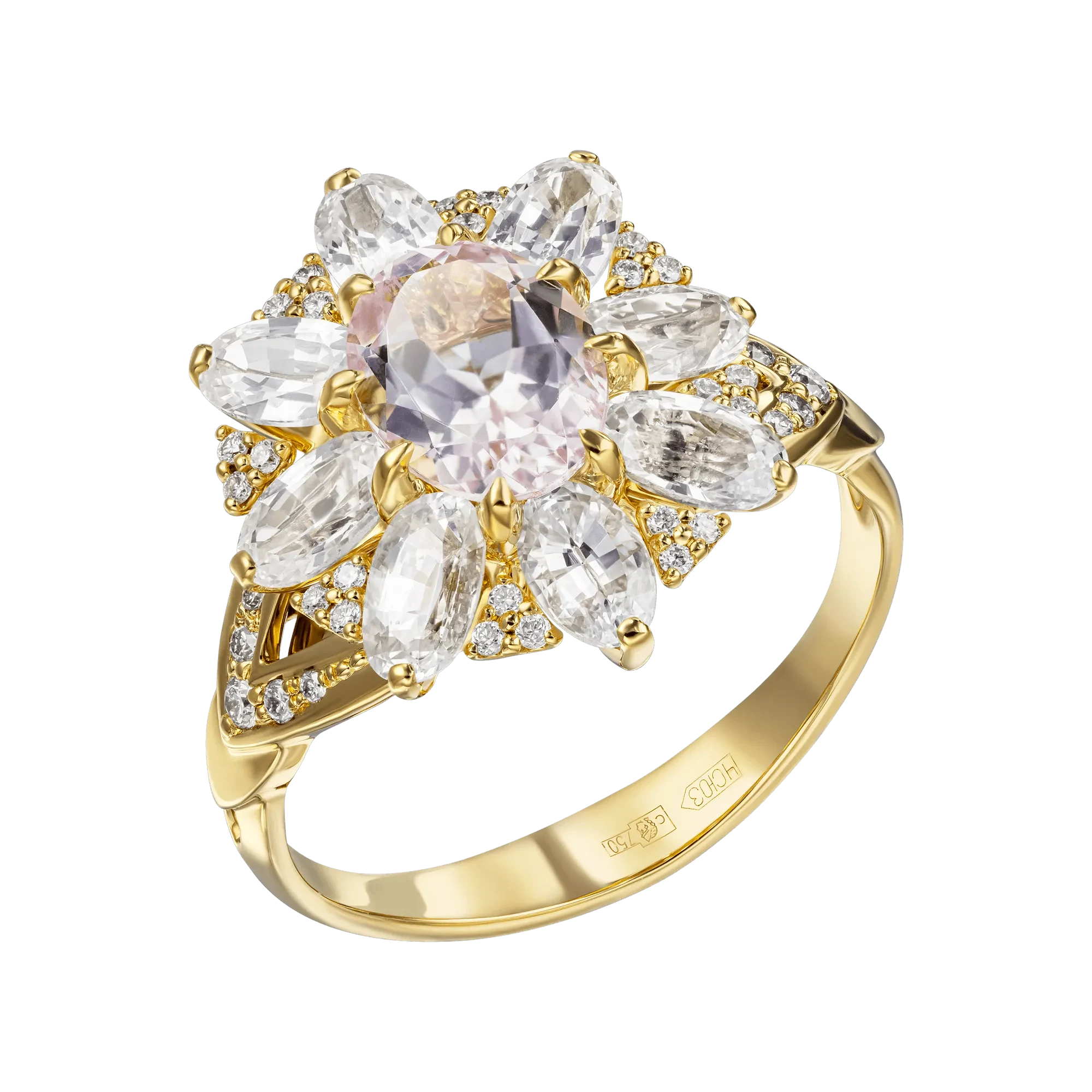 Чтобы подчеркнуть мягкие, с ноткой таинственности, глубинные переливы самоцвета весом 1,05 карата, дизайнеры поместили кристалл в артистичный по выкладке, но монохромный по цвету узор из бриллиантов и сапфиров. Прозрачные минералы, закрепленные на основе из желтого золота, будто лепестки элегантного растения окружают пудровый, виртуозно ограненный бутон.