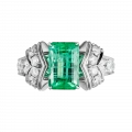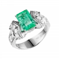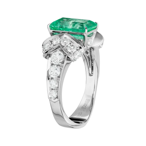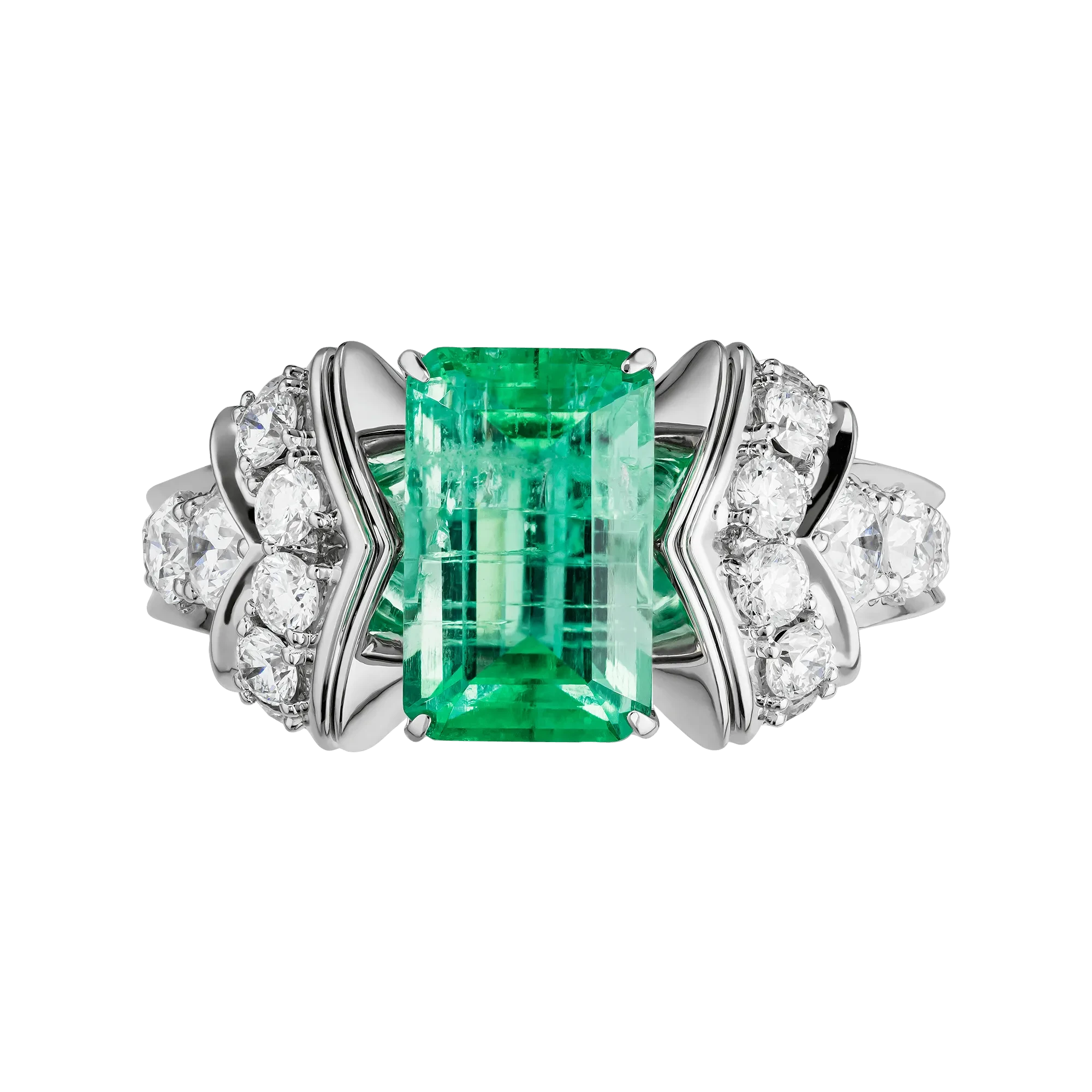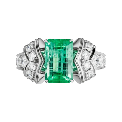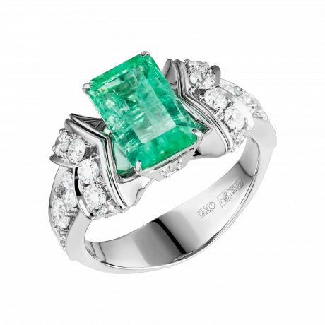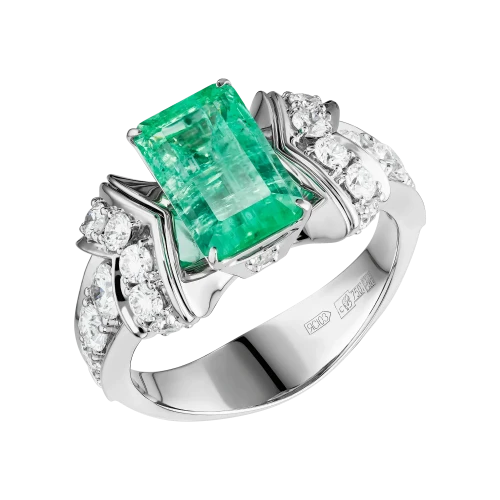 В центре композиции сияет уральский изумруд весом 2,28 карата с характерной глубиной холодного зелёного тона. Его цвет раскрывается в отражающей чаше оправы, выполненной в форме бабочки: зеркальная поверхность многократно усиливает блеск драгоценного камня, позволяя свету работать не на поверхности, а внутри формы. При движении оттенок меняется, создавая ощущение живого, подвижного цвета.