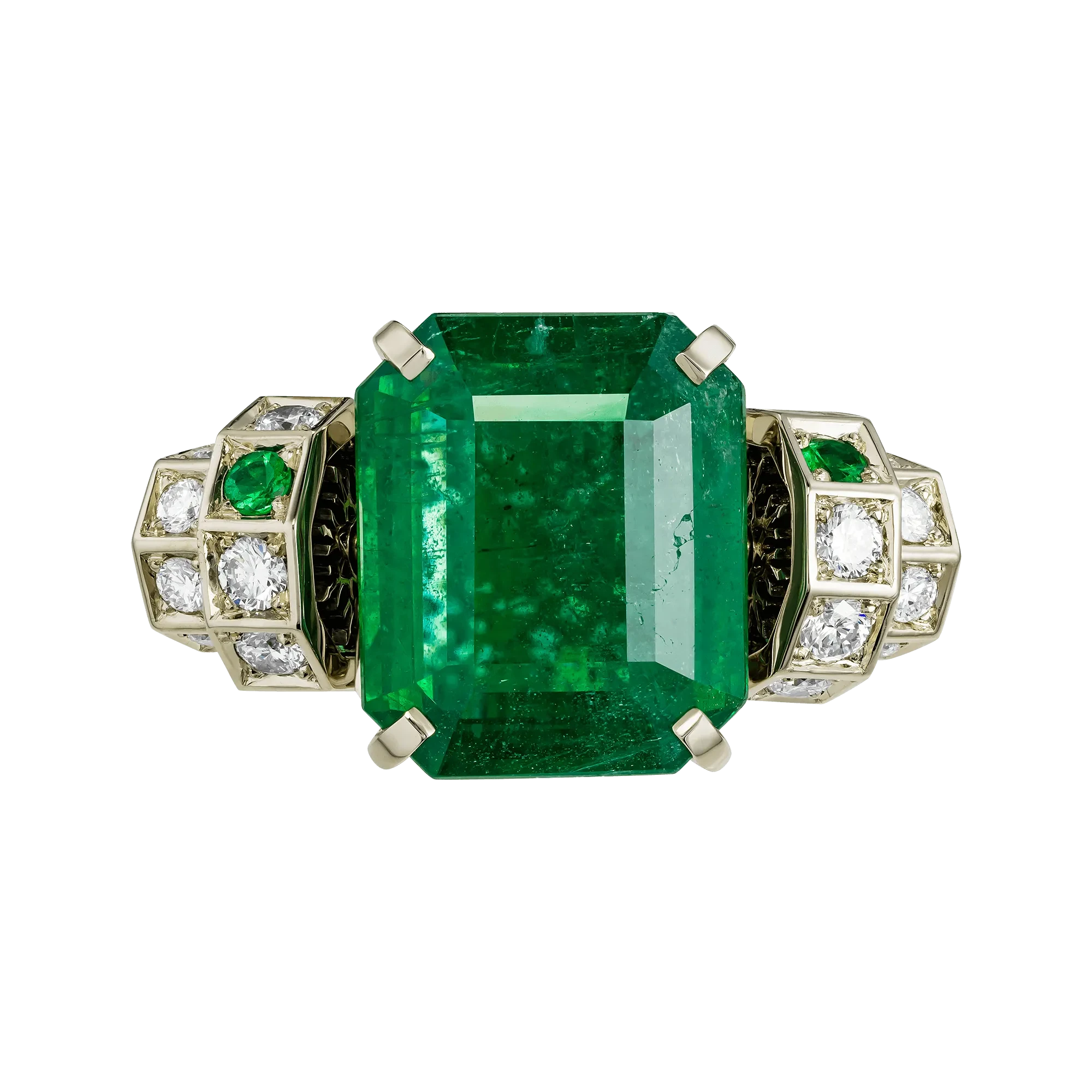 В сердце композиции — замбийский изумруд весом 7,82 карата, самоцвет, издавна связанный с темами прозрения, гармонии и внутреннего знания. Его насыщенный зелёный цвет воспринимается как концентрированная энергия жизни — спокойная и уверенная. Изумруд заключён в подвижную конструкцию: два элемента оправы, инкрустированные бриллиантами, мягко вращаются вокруг оси, создавая ощущение непрерывного движения и поиска.