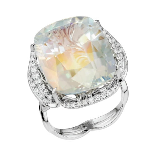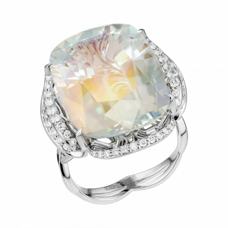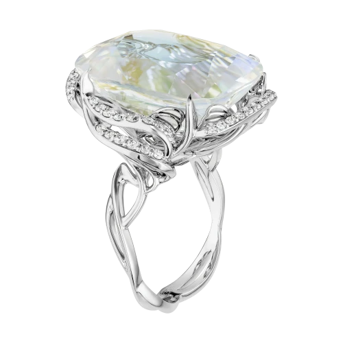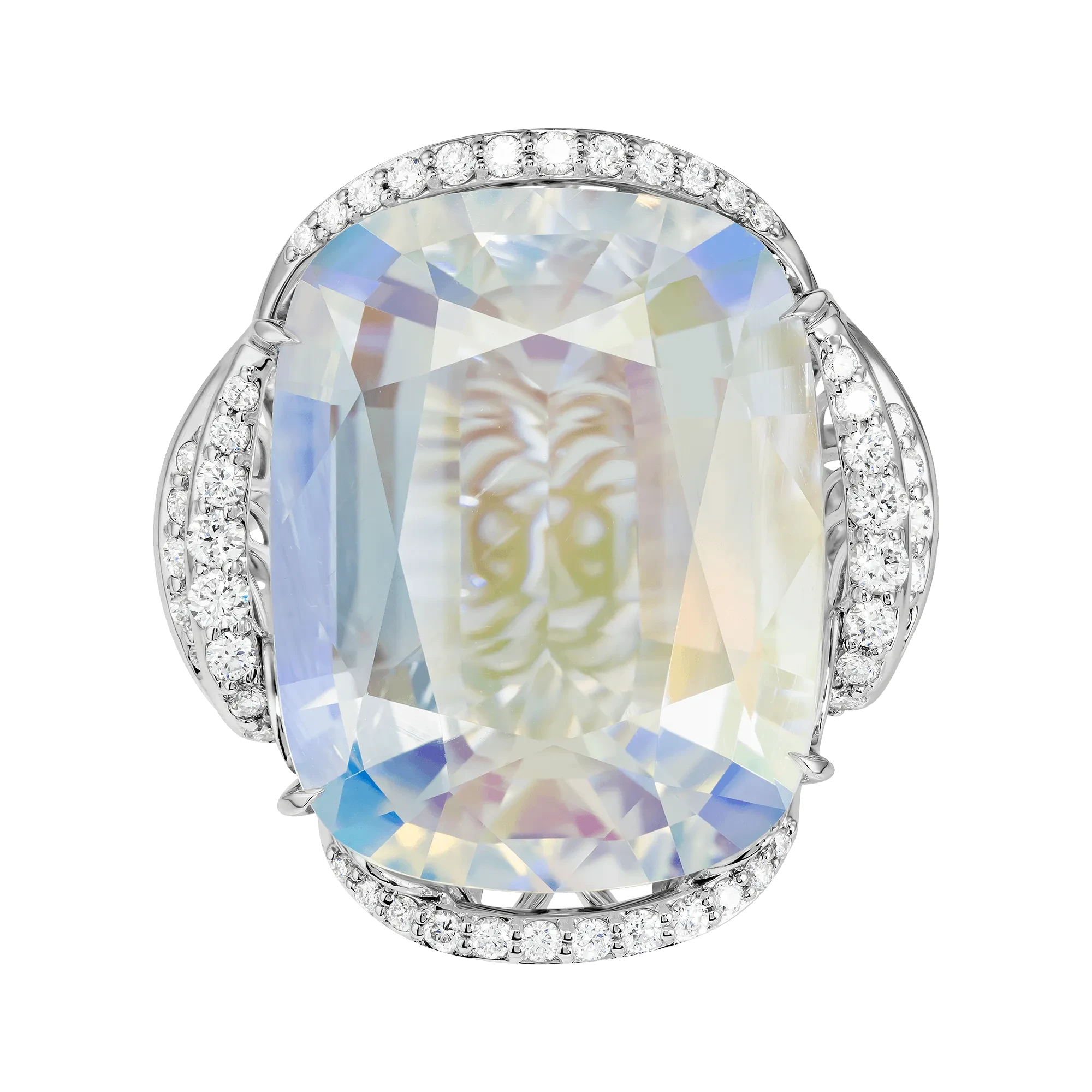В авторском кольце центральную роль играет крупный лунный камень весом 17,64 карата, добытый на Мадагаскаре — одном из немногих мест, где природа создаёт кристаллы с особенно чистой и глубокой адуляресценцией. Внутреннее свечение камня возникает благодаря тончайшему чередованию слоёв полевых шпатов в его структуре: свет, проникая внутрь, рассеивается и отражается, формируя мягкий, текучий отблеск, словно лунный свет, скользящий по ночной поверхности воды. Именно за такую оптическую природу мадагаскарские лунные камни ценятся на уровне коллекционных экземпляров.